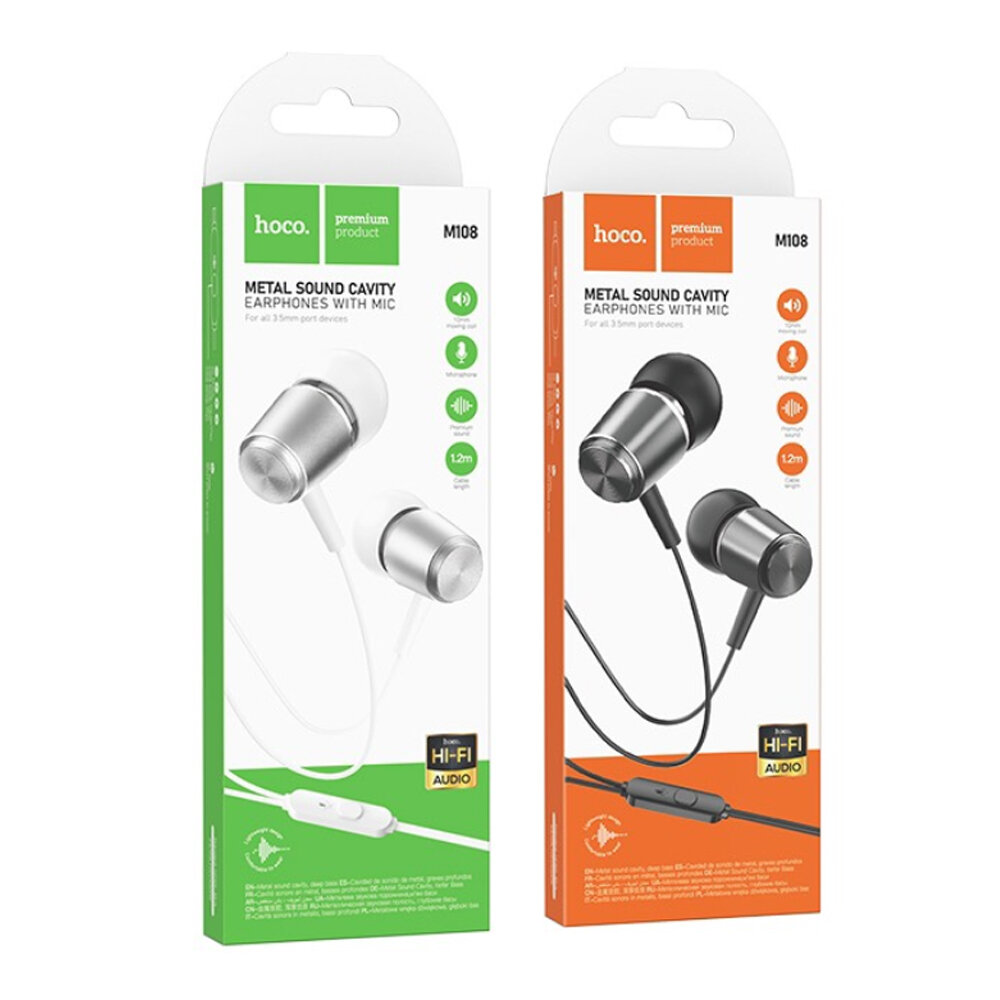 Проводные наушники M108, Spring metal universal, HOCO, вакуумные с микрофоном, серебряный