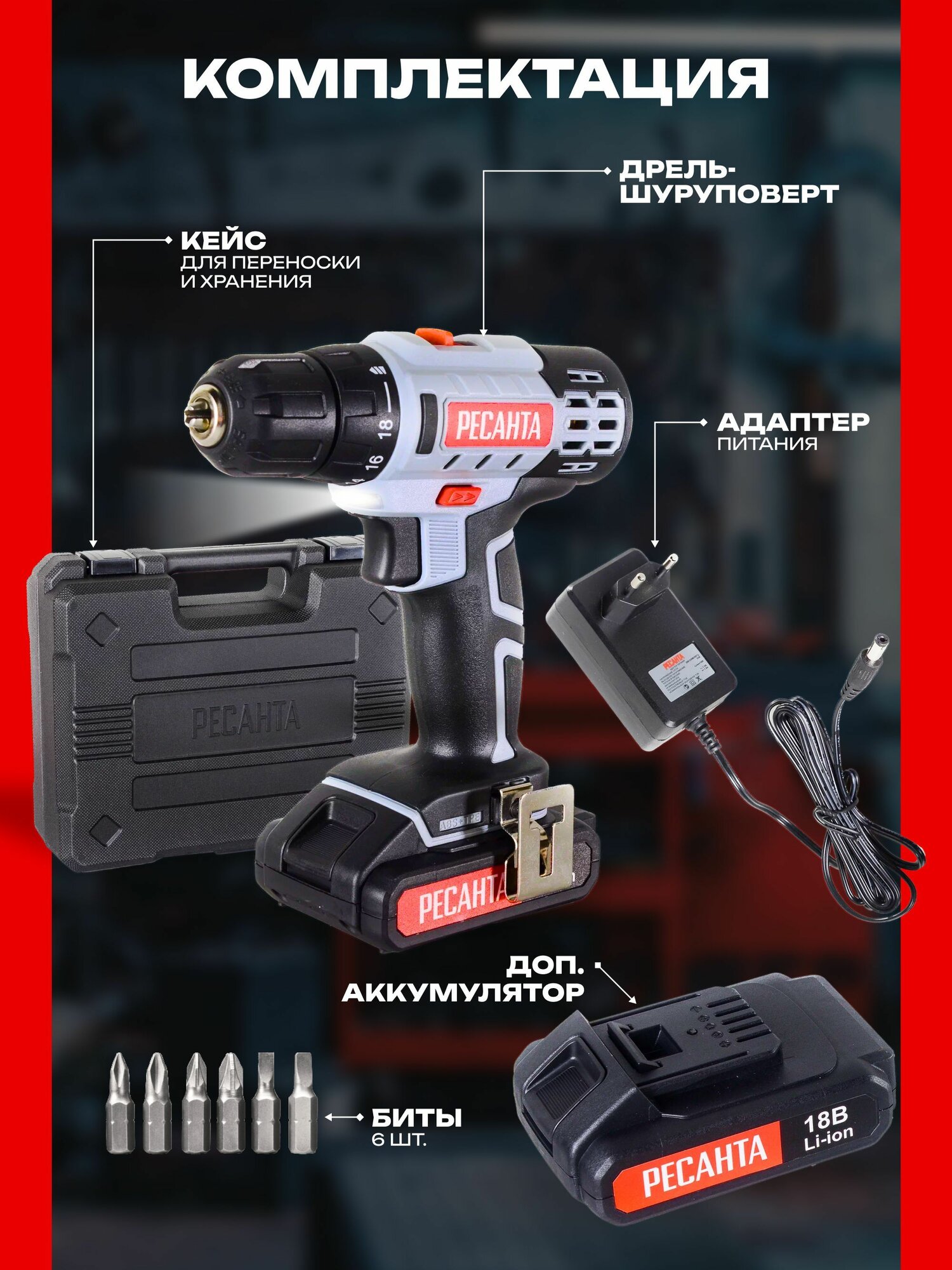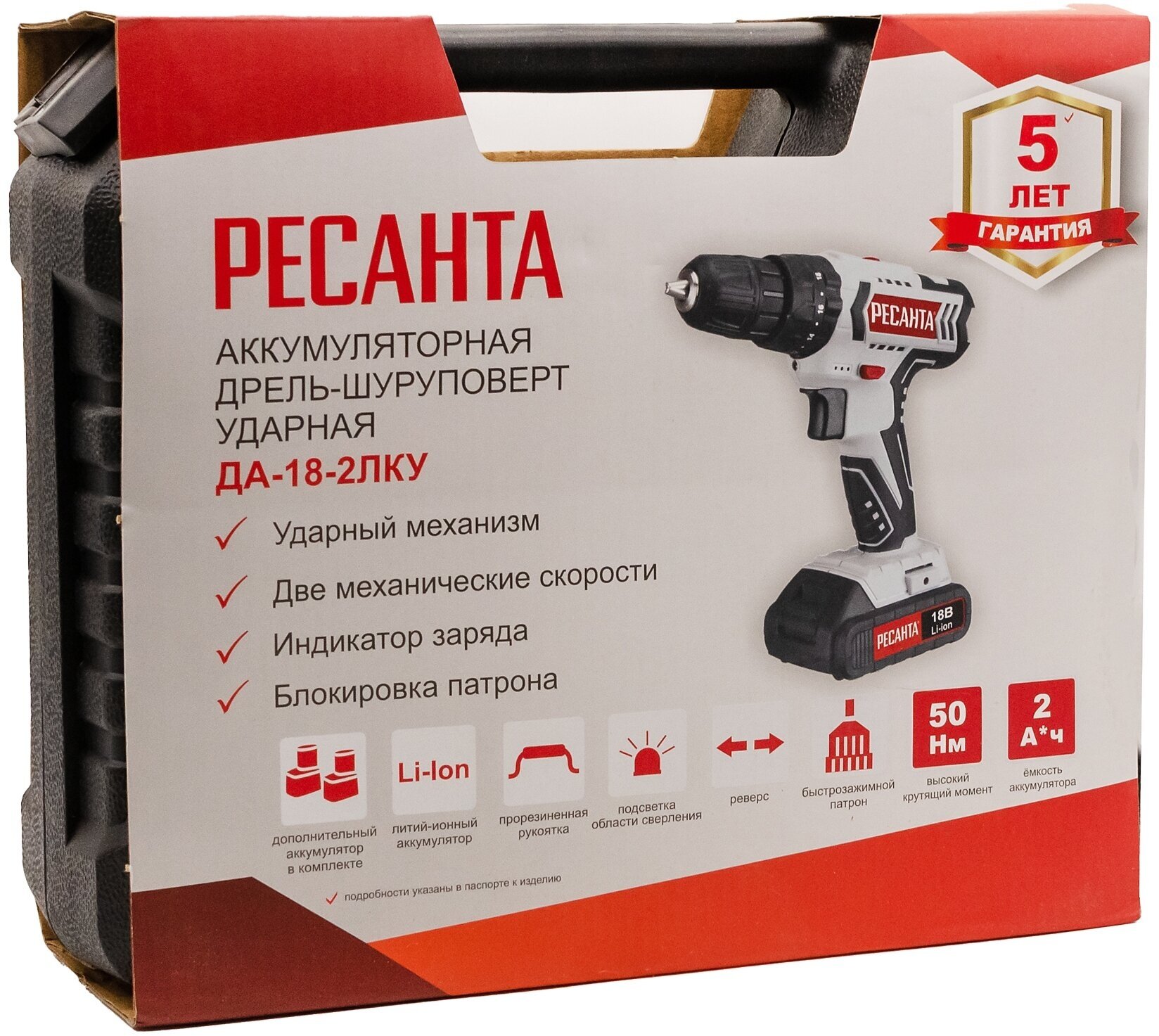 Дрель-шуруповерт аккумуляторная Ресанта ДА-18-2ЛК-У, 18 В, 2 x 2 Ач, Li-Ion, ЗУ