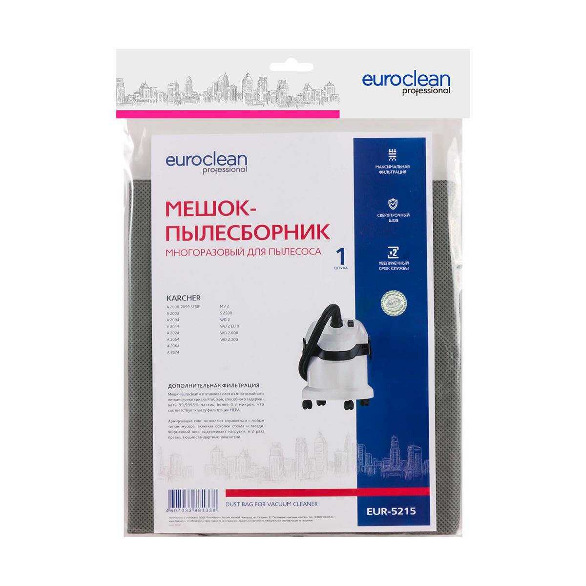 Многоразовый фильтр-мешок EUROCLEAN EUR-5215 с текстильной застежкой для пылесоса KARCHER MV 2, WD 2, 1 шт