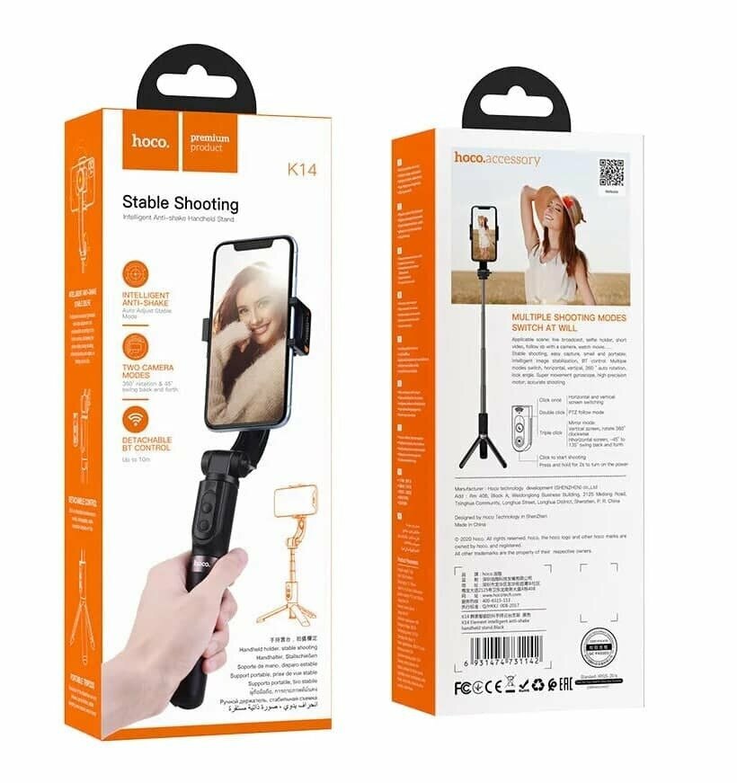 Стабилизатор двухосевой , селфи палка, штатив для телефона Bluetooth с пультом, Hoco K14 , черный