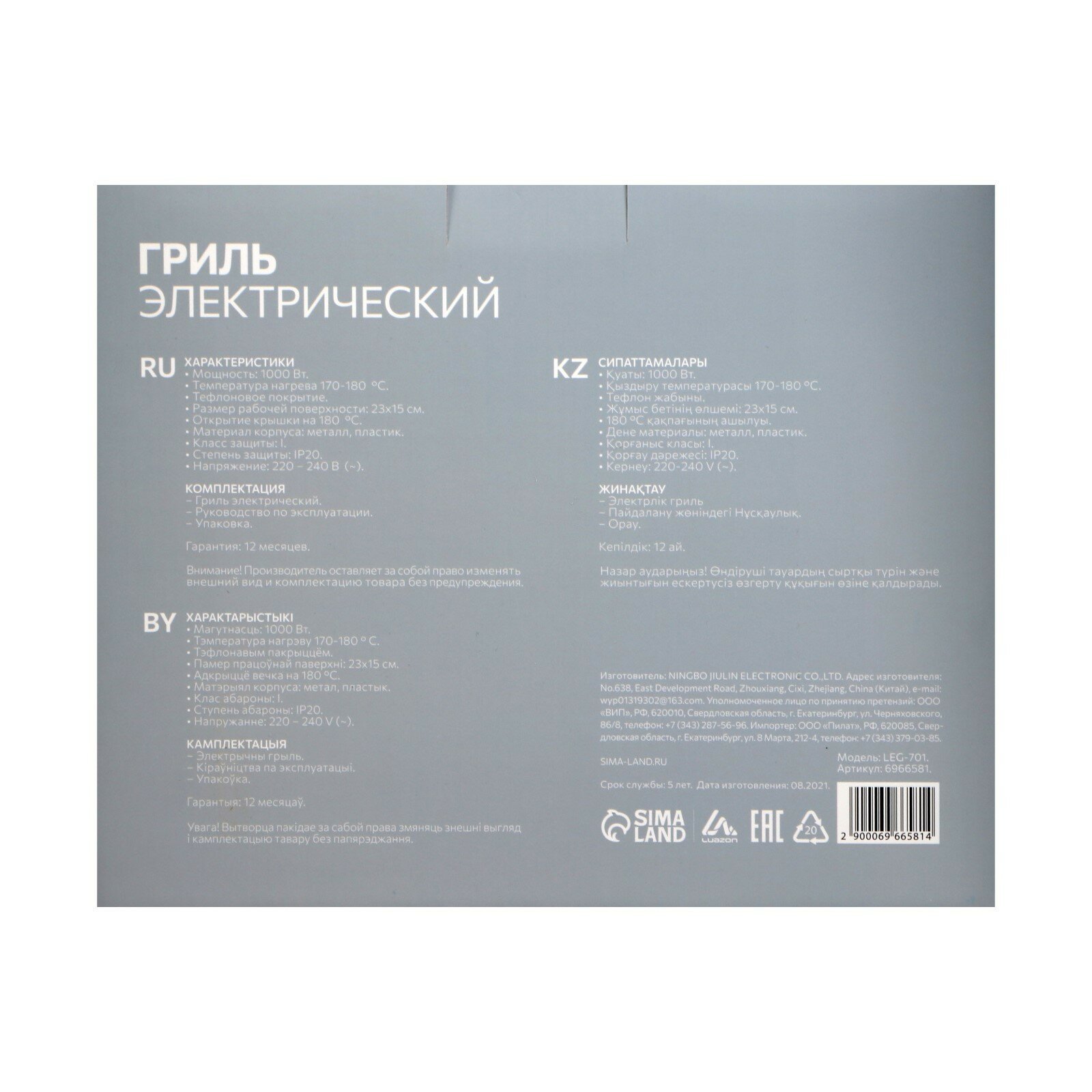 Электрогриль LuazON модель Leg-701, 1000 Вт, антипригарное покрытие, 23х15 см Luazon Home 6966581 .