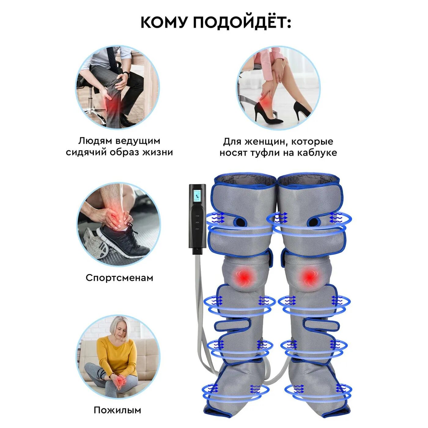 Снимает усталость, уходят боли в ногах и снимаются отеки, появляется ощущение легкости сразу после завершения процедуры. Мое спасение после рабочего дня( стоячая работа), длительной пешей прогулки. Пользуюсь полгода и ощущаю себя заметно лучше. Появились силы и энергия на прогулки. Массажер подойдет для всей семьи, так как есть регулирующие по размеру ноги липучки, и режимы с разной силой и интенсивностью. Так же с помощью режимов можно выбирать отдельные участки ног массажа. Есть подогрев коленей - для людей у кого проблема суставами однозначно плюс) Рекомендую! |