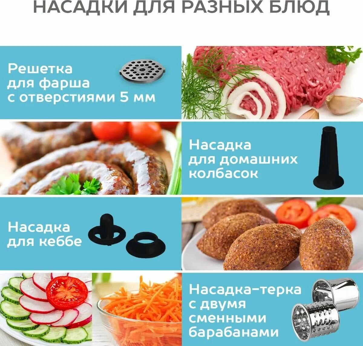 | Диск для фарша | 2 в комплекте, диаметр отверстий 5 мм, 7 мм |