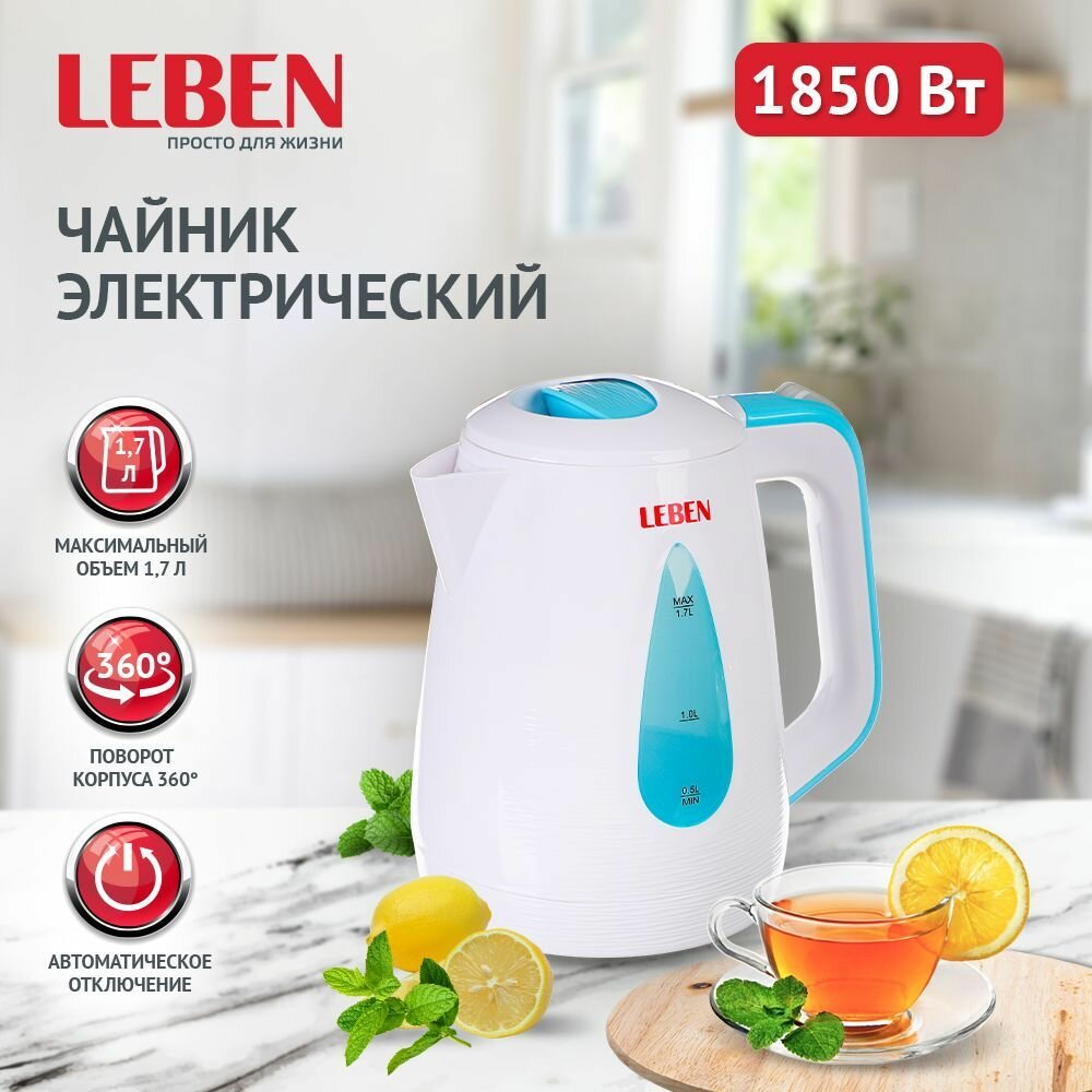 Чайник электрический 1, 7 л LEBEN, 1850 Вт, скрытый нагревательный элемент, пластик, белый/бирюзовый интересное: