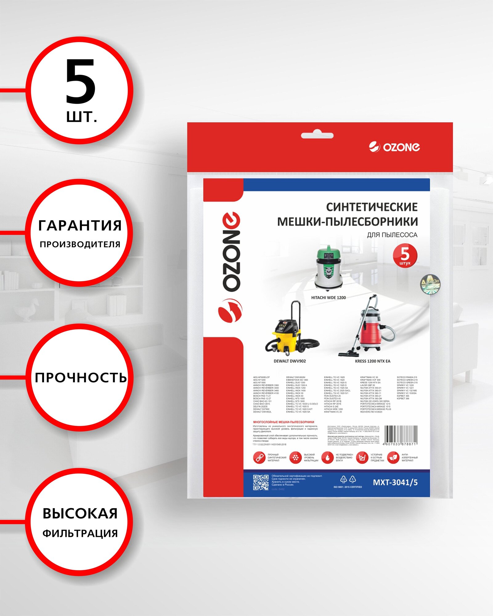 Пылесборник OZONE MXT-3041/5 синтетические, для AEG, NILFISK, EINHELL, BOSCH упаковка 5 штук / мешки для пылесоса