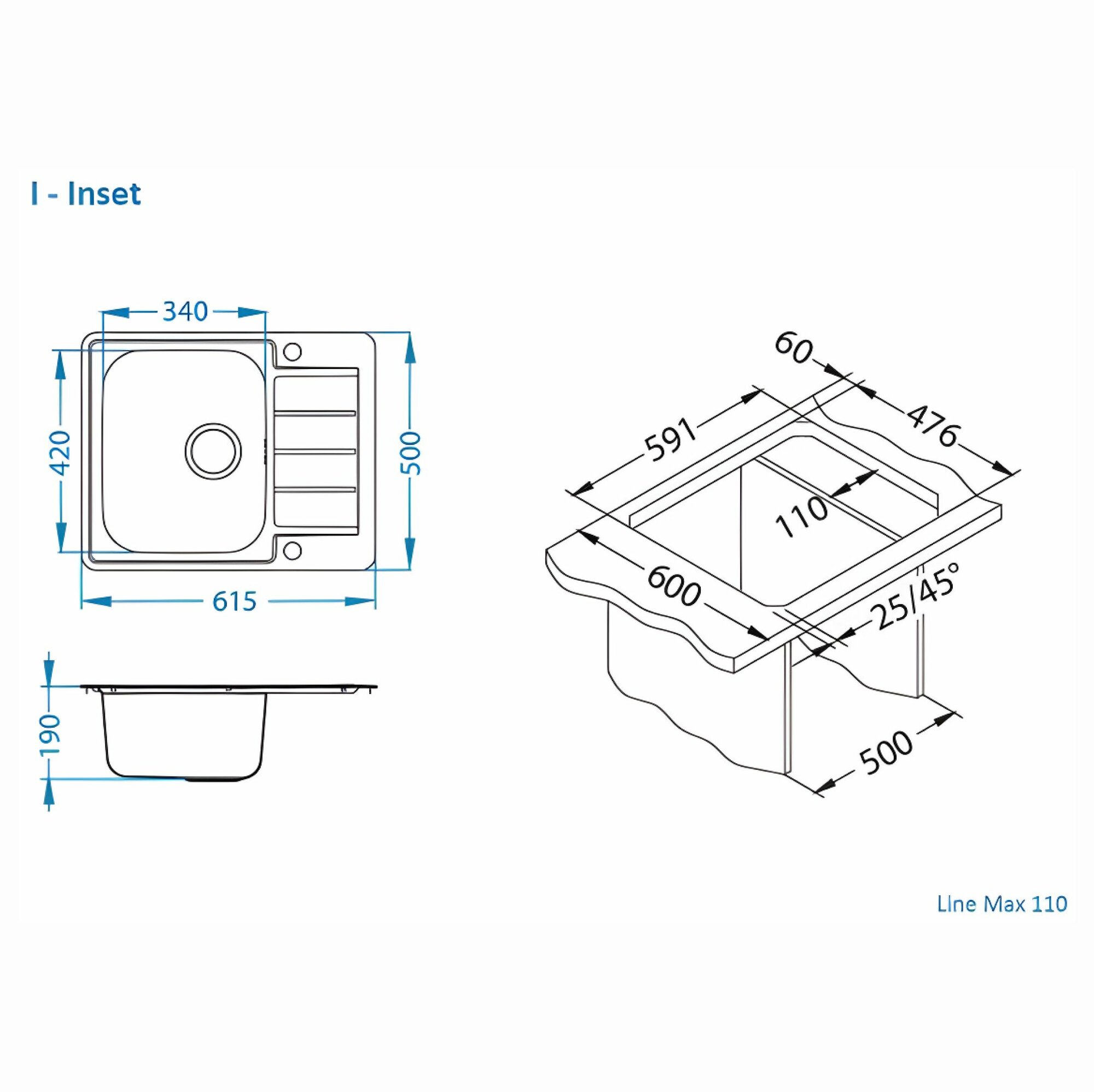 Мойка Alveus LINE 110 NAT 90 FI 615X500 в компл. с сифоном 1130551