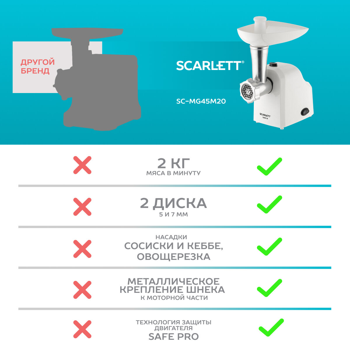 Мясорубка SCARLETT SC-MG45M20, 1800 Вт, производительность 2 кг/мин, 4 насадки, реверс, пластик, белая
