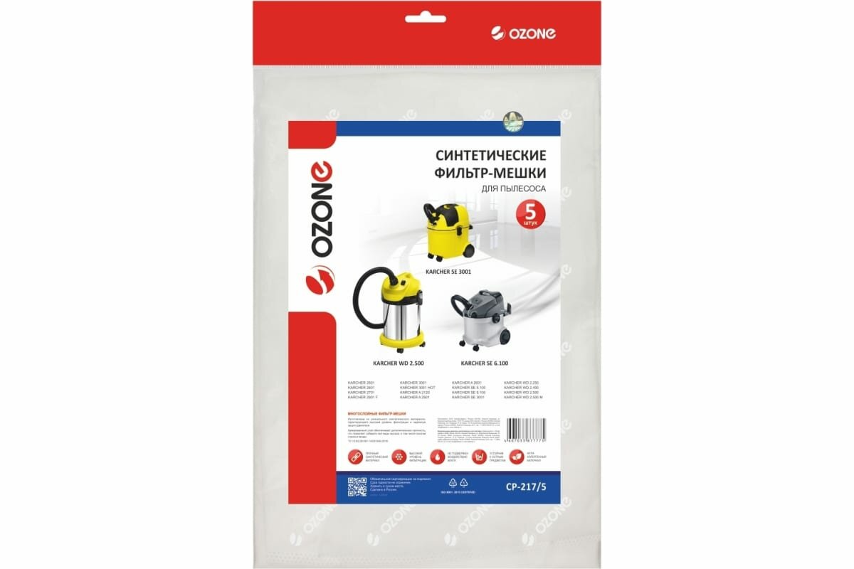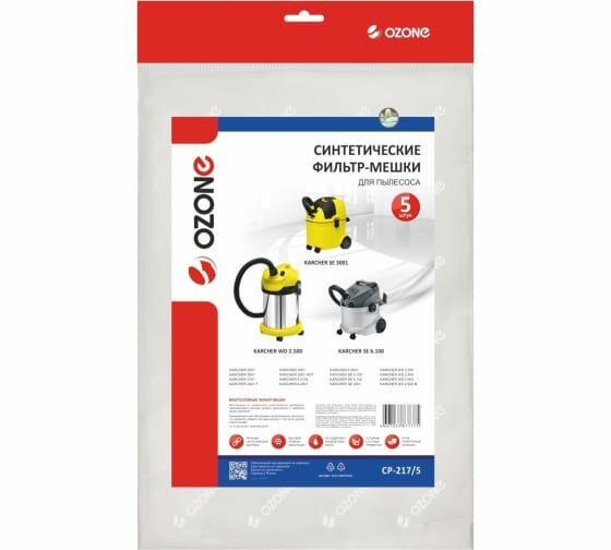 OZONE Фильтр-мешки для пылесоса KARCHER, 5 шт., синтетика, не боятся мокрой пыли, арт. CP-218/5