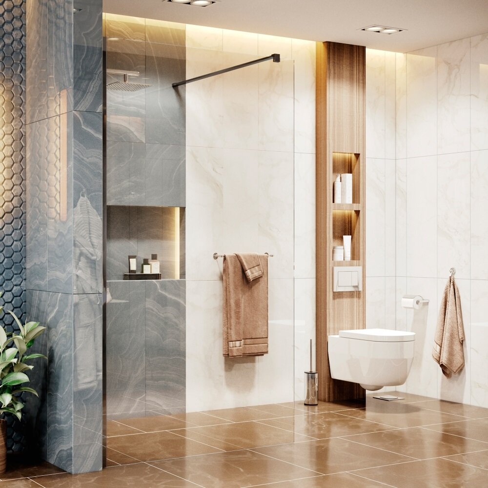 Душевая перегородка 90 см со свободным входом Ambassador Walk-in 15031109: душевая ширма из стекла 8 мм, профиль черный