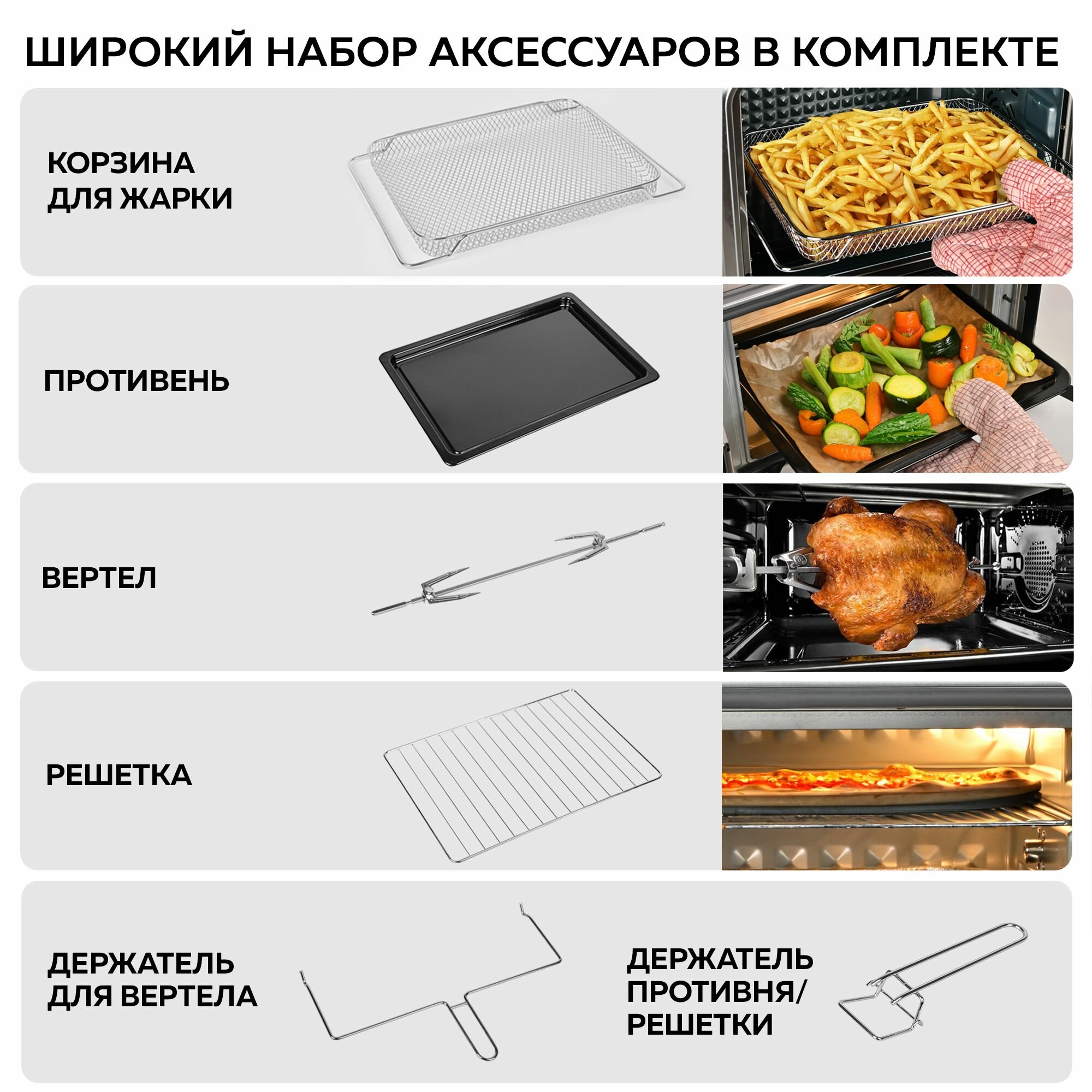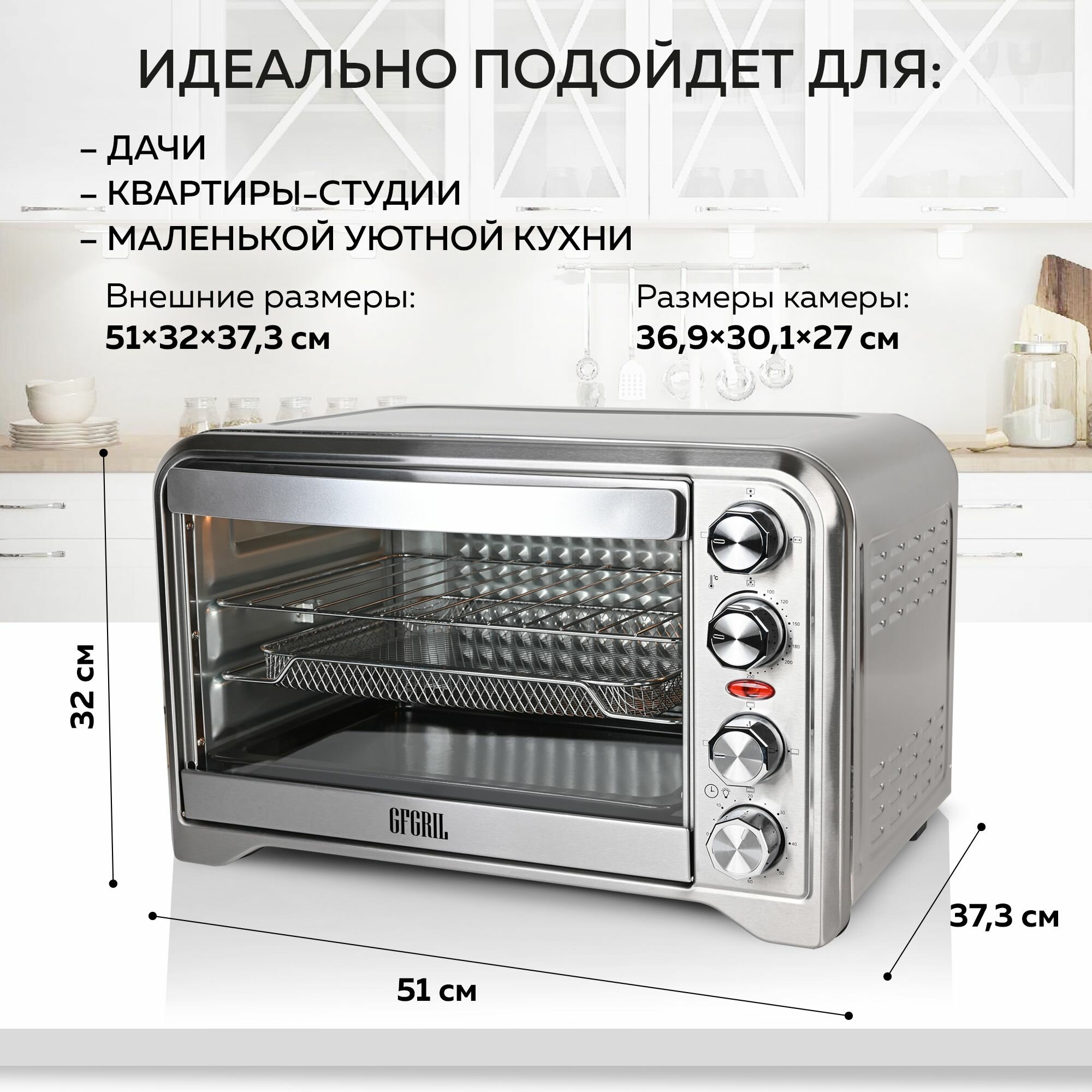 GFGRIL Многофункциональная мини-печь GFO-34, противень-корзина и вертел в комплекте, до 250 градусов, духовой шкаф 1600 Вт, мини печь 30 л