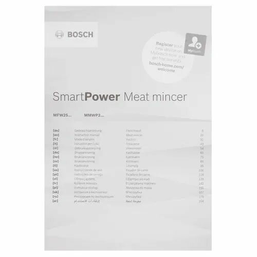 Купить Мясорубка Bosch MMWP2004 SmartPower, белая, 350 Вт, 3 барабана, универсальный толкатель, прорезиненные ножки