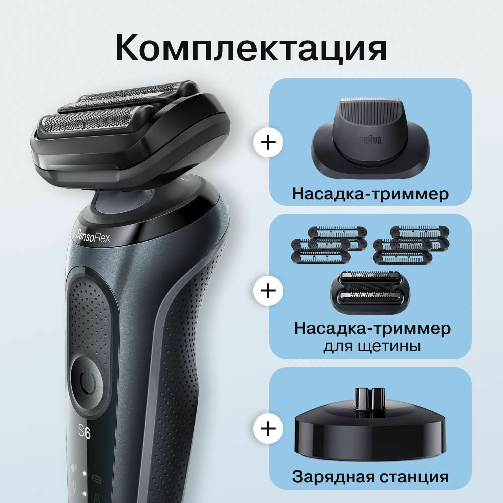 Электробритва, бритва Braun, черный/синий, сеточная, быстрая зарядка, дисплей, триммер