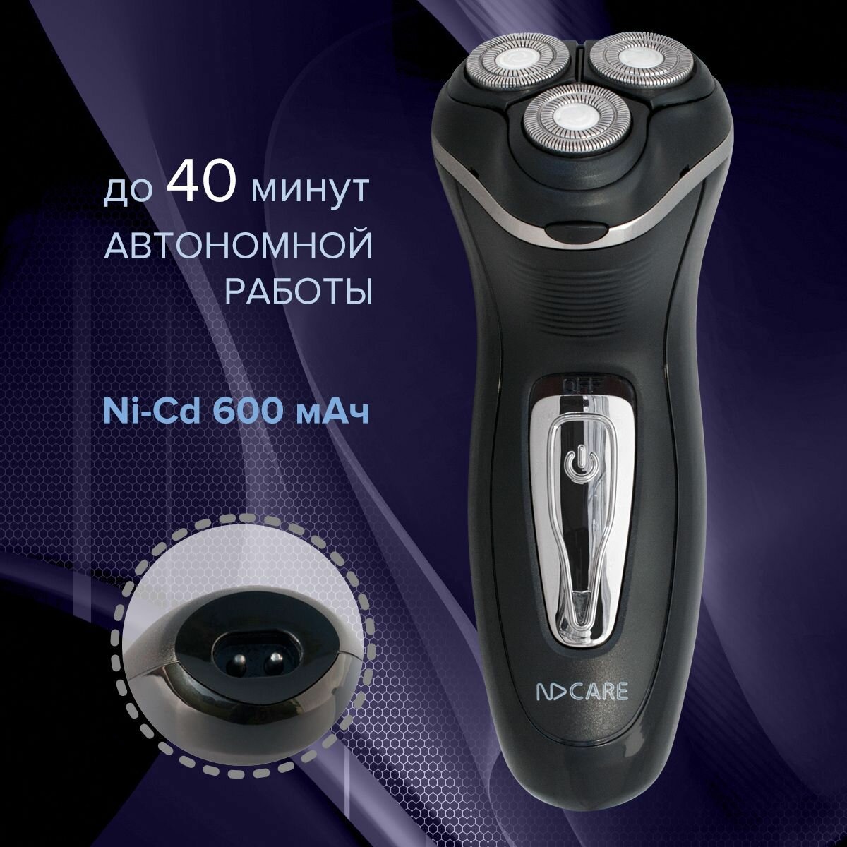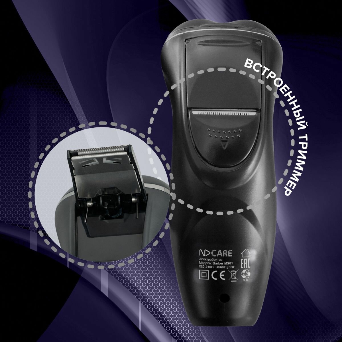 Электробритва NDCare Barber MS01 черный/серебристый [бритье: сухое, головок - 3, роторная, триммер, питание - от аккумулятора]