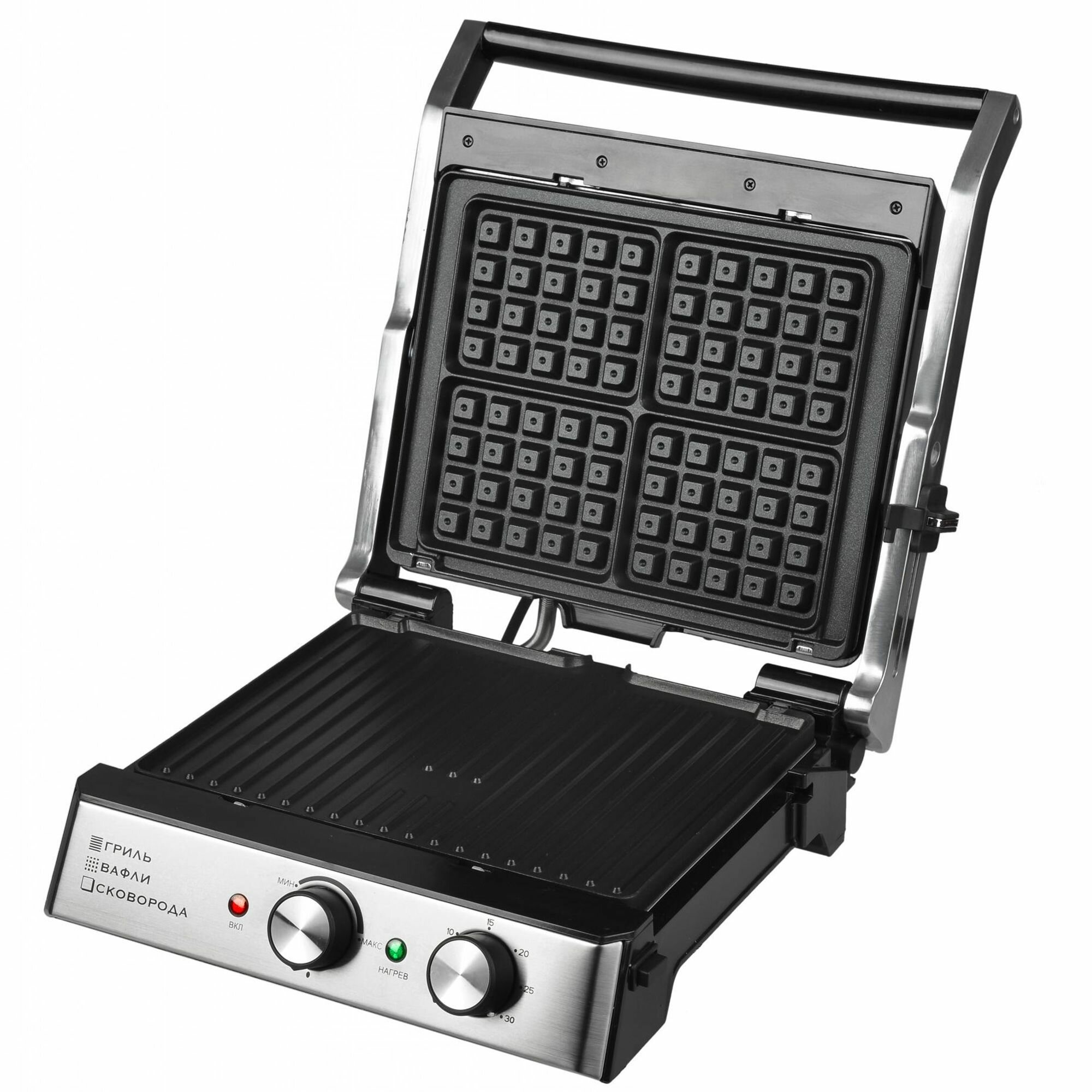 | Дополнительная информация | функция: гриль/вафли/панини, взаимозаменяемые съемные панели, рабочая поверхность 29х23см, встроенный таймер до 30 мин со звуковым сигналом, хранение в вертикальном положении |