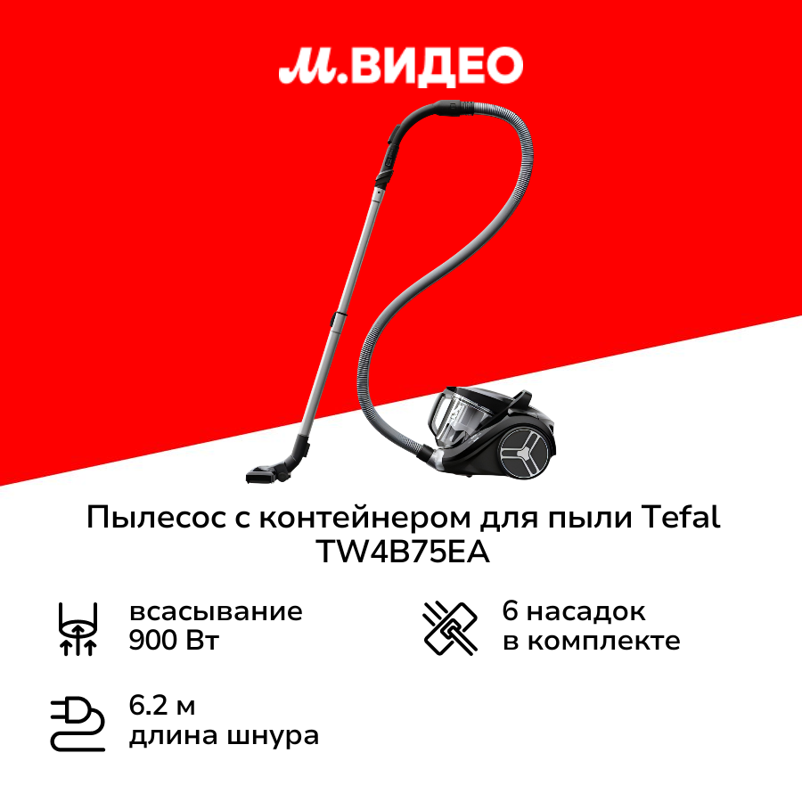 Купить Пылесос с контейнером Tefal Compact Power XXL TW4B75EA, черный, 900 Вт, 2,5 л, безмешковый, ручка для переноски