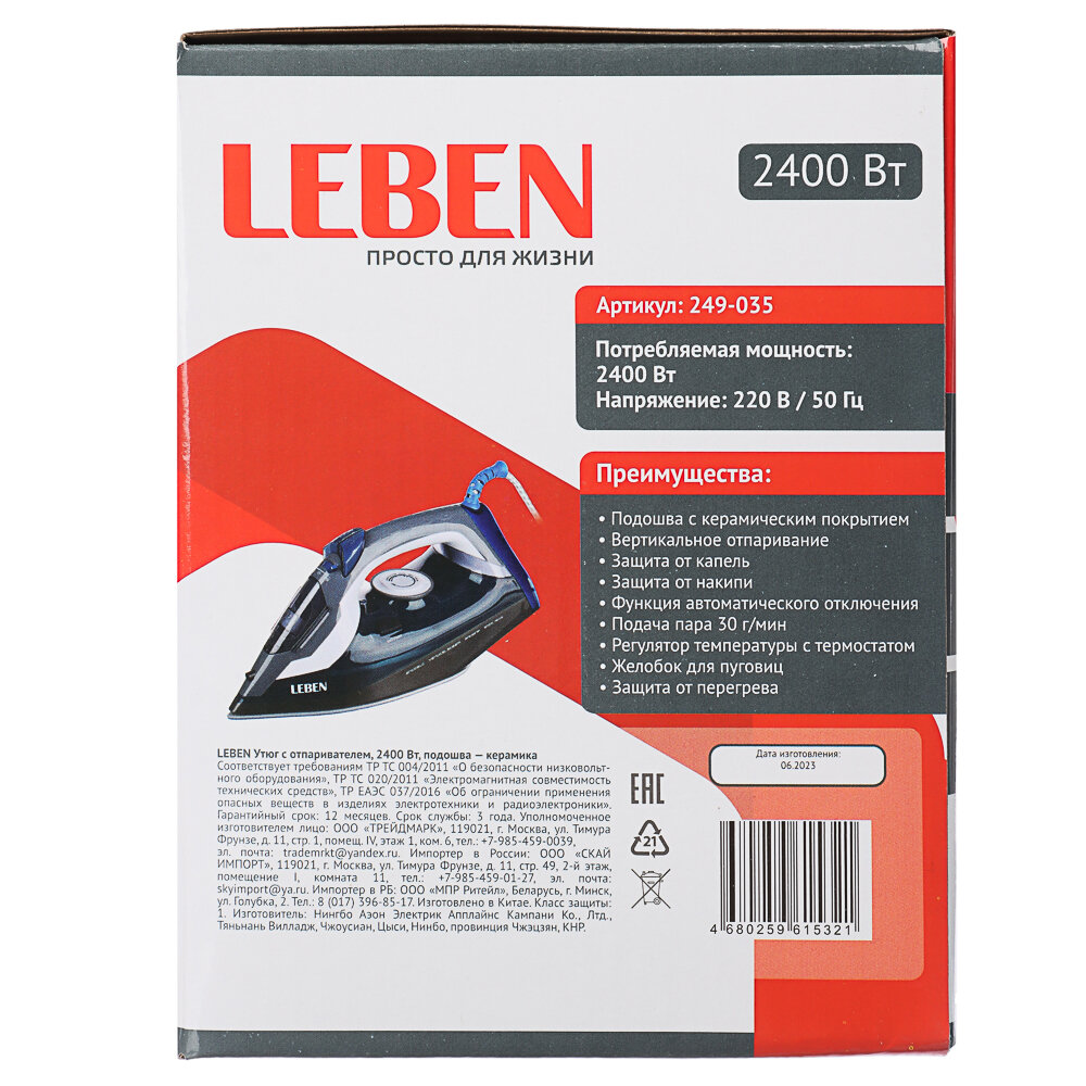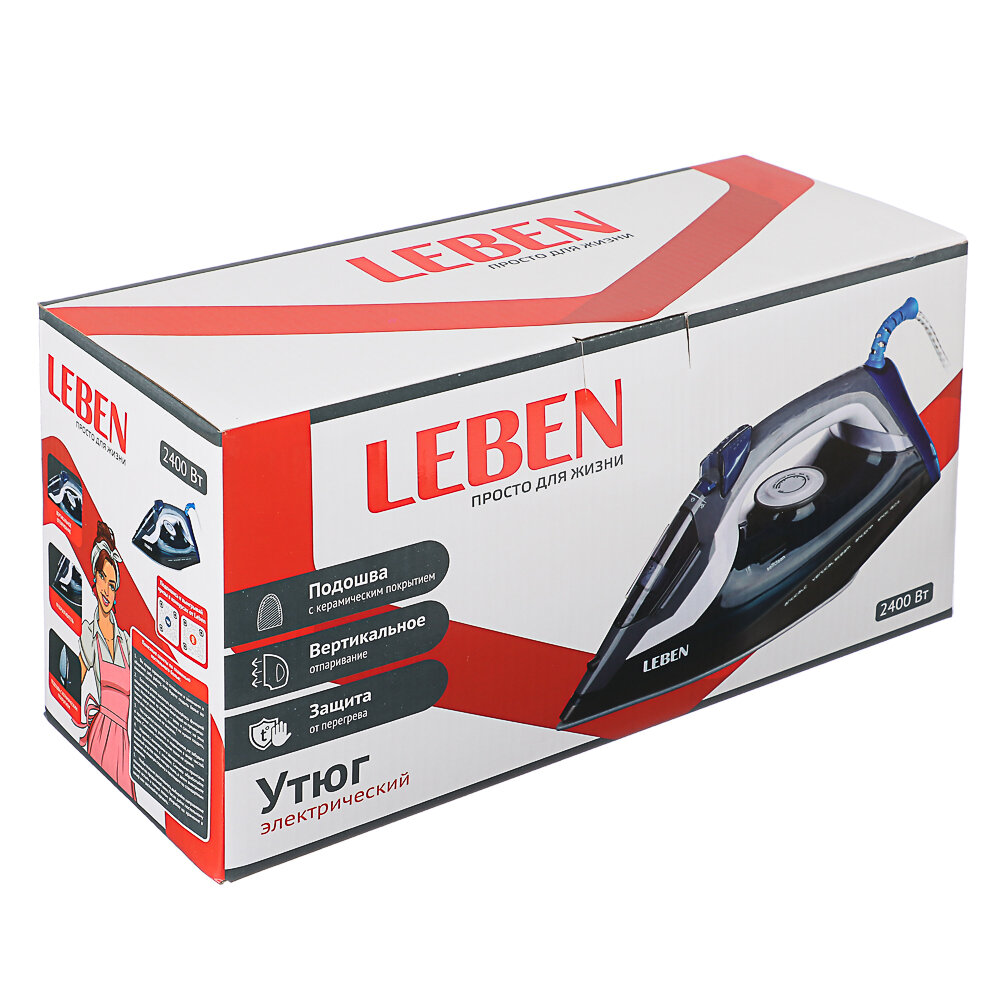 Утюг с отпаривателем 2400 Вт LEBEN, подошва - керамика, вртикальное отпаривание, защита от перегрева интересное: