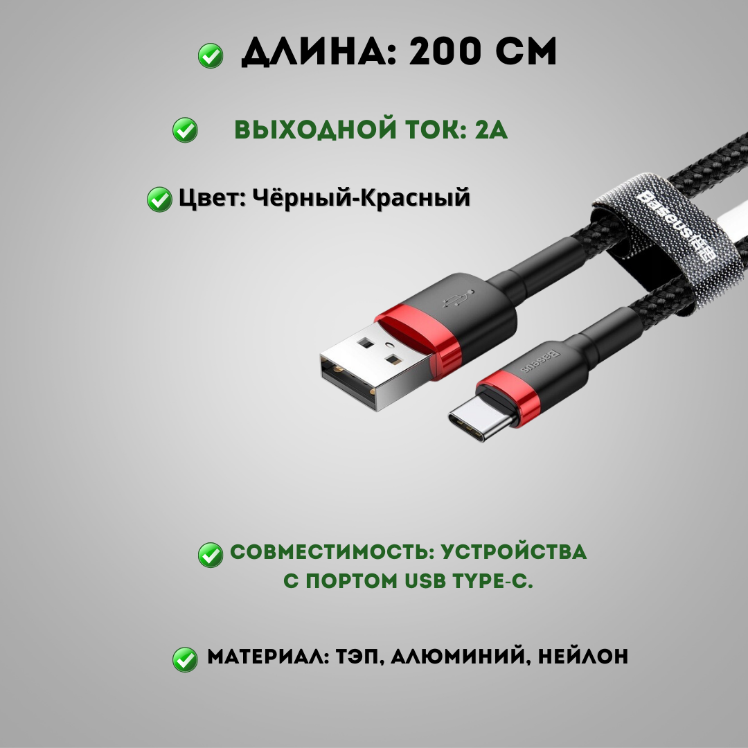 Кабель USB BASEUS Cafule, USB - Type-C, 2А, 2 м, красный+черный