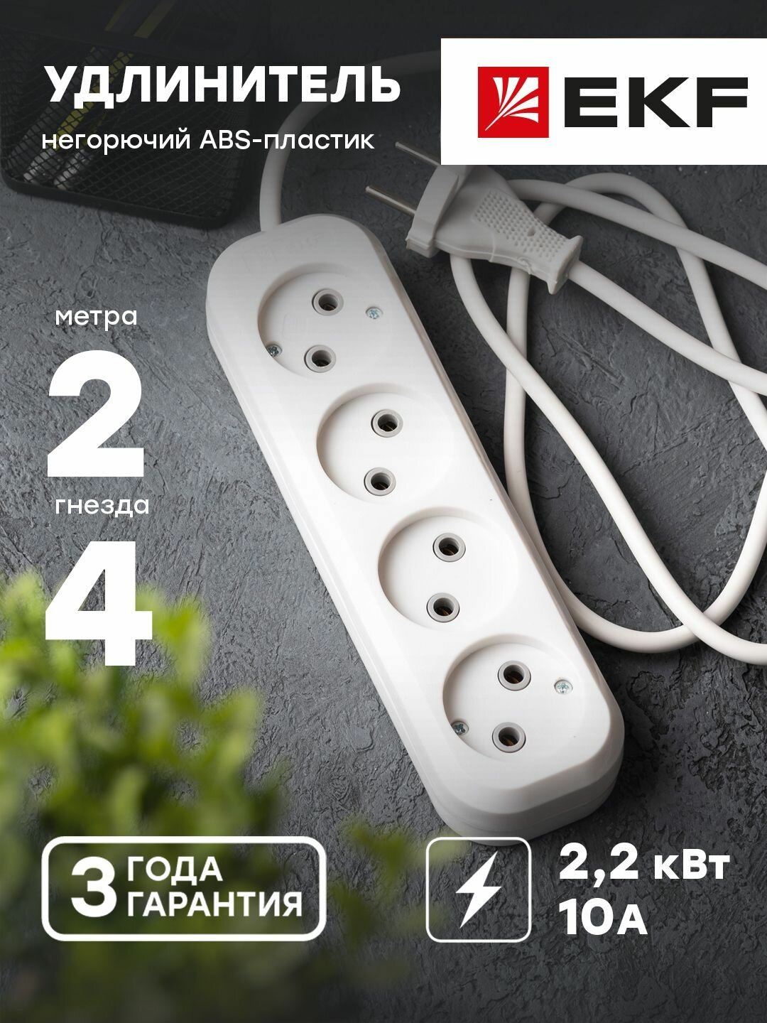 Удлинитель "Эксперт" 4 гнезда 2 метра 10А-2,2кВт без заземления ПВС 2х0,75 EKF PROxima - 1 шт интересное: