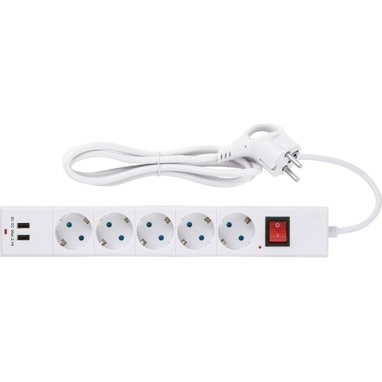 Сетевой фильтр düwi 5 гнезд с/з ПВС 3*0,75 1,5м, 10А/2,2кВт, с детскими шторками, 2USB, белый