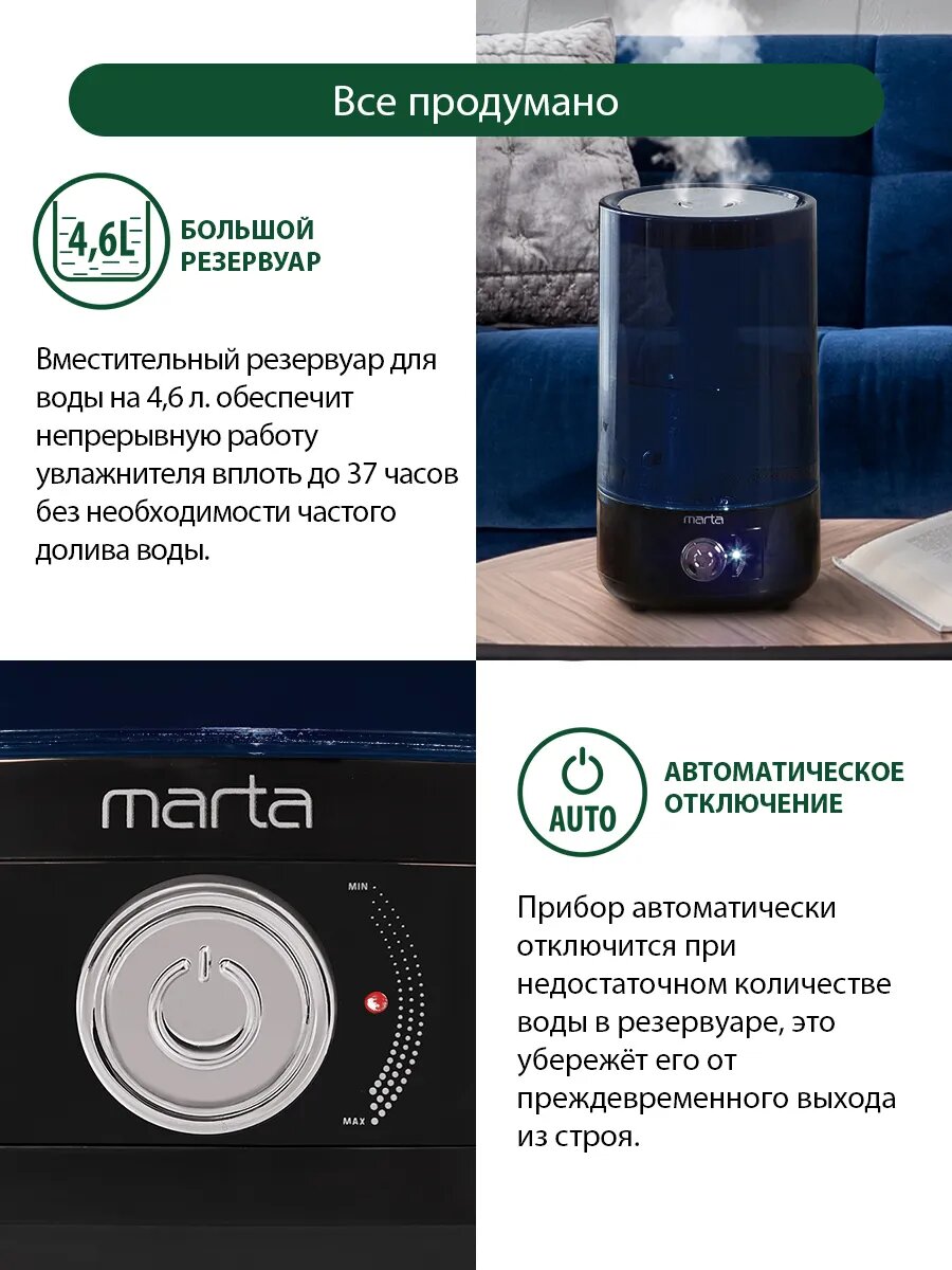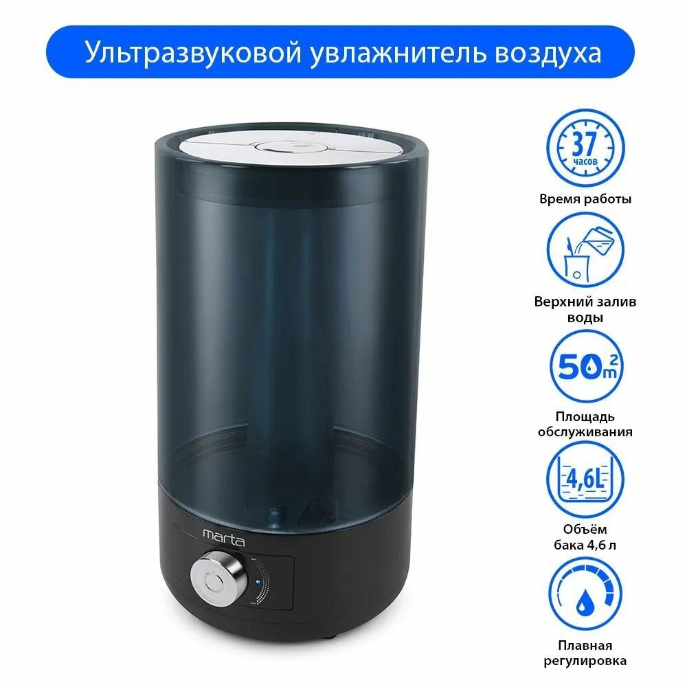 Увлажнитель воздуха Marta MT-2378 черный жемчуг 30W, ультразвуковой, верхний залив, 4,6л., механичес