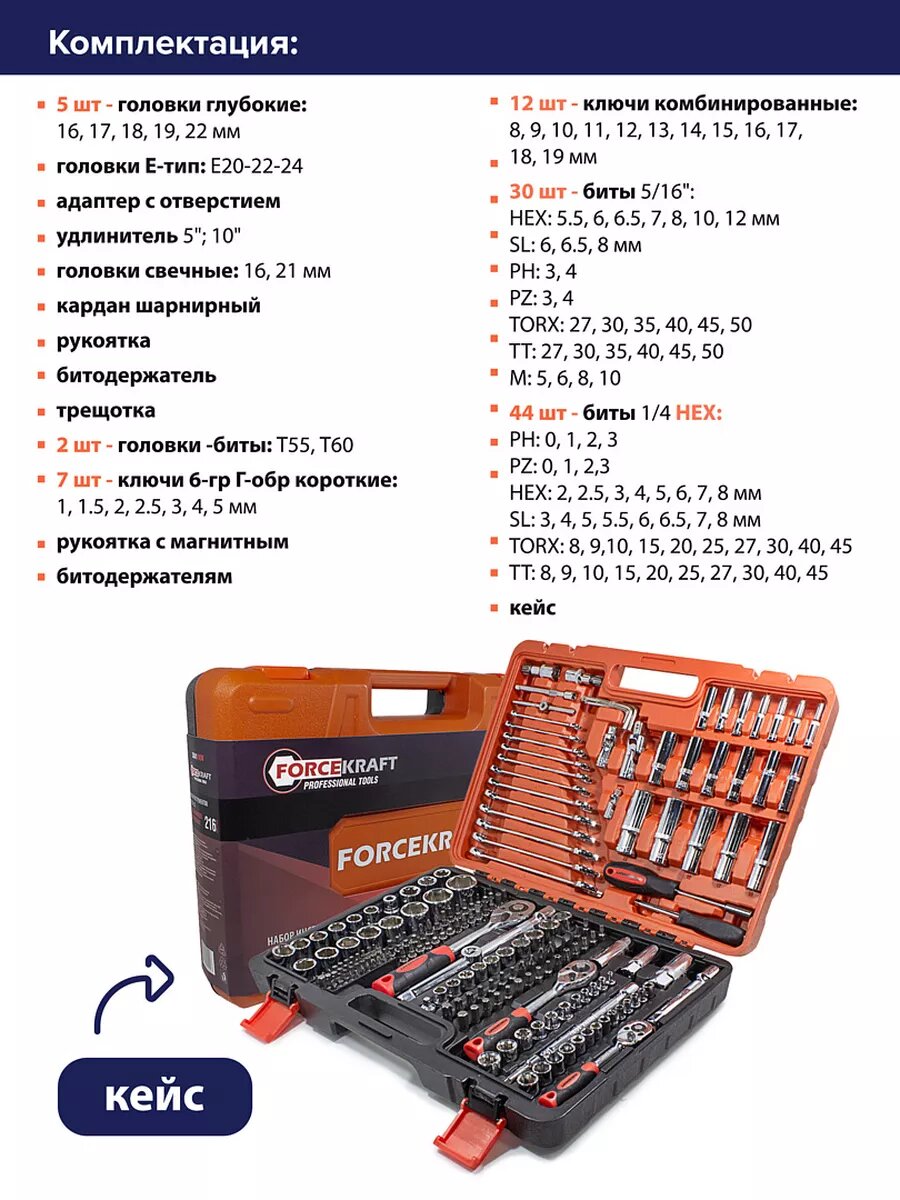 Купить Набор инструментов 216 предметов FORCEKRAFT 1/4''3/8''1/2''(6гр.)(4-32мм)