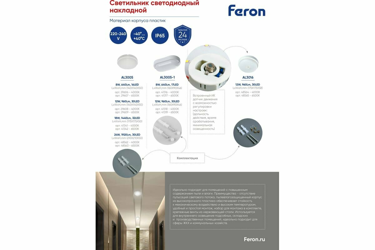 Feron Светильник светодиодный пылевлагозащищённый, 12W, 900Lm, 4500K, в пластиковом корпусе, Ip54, A .