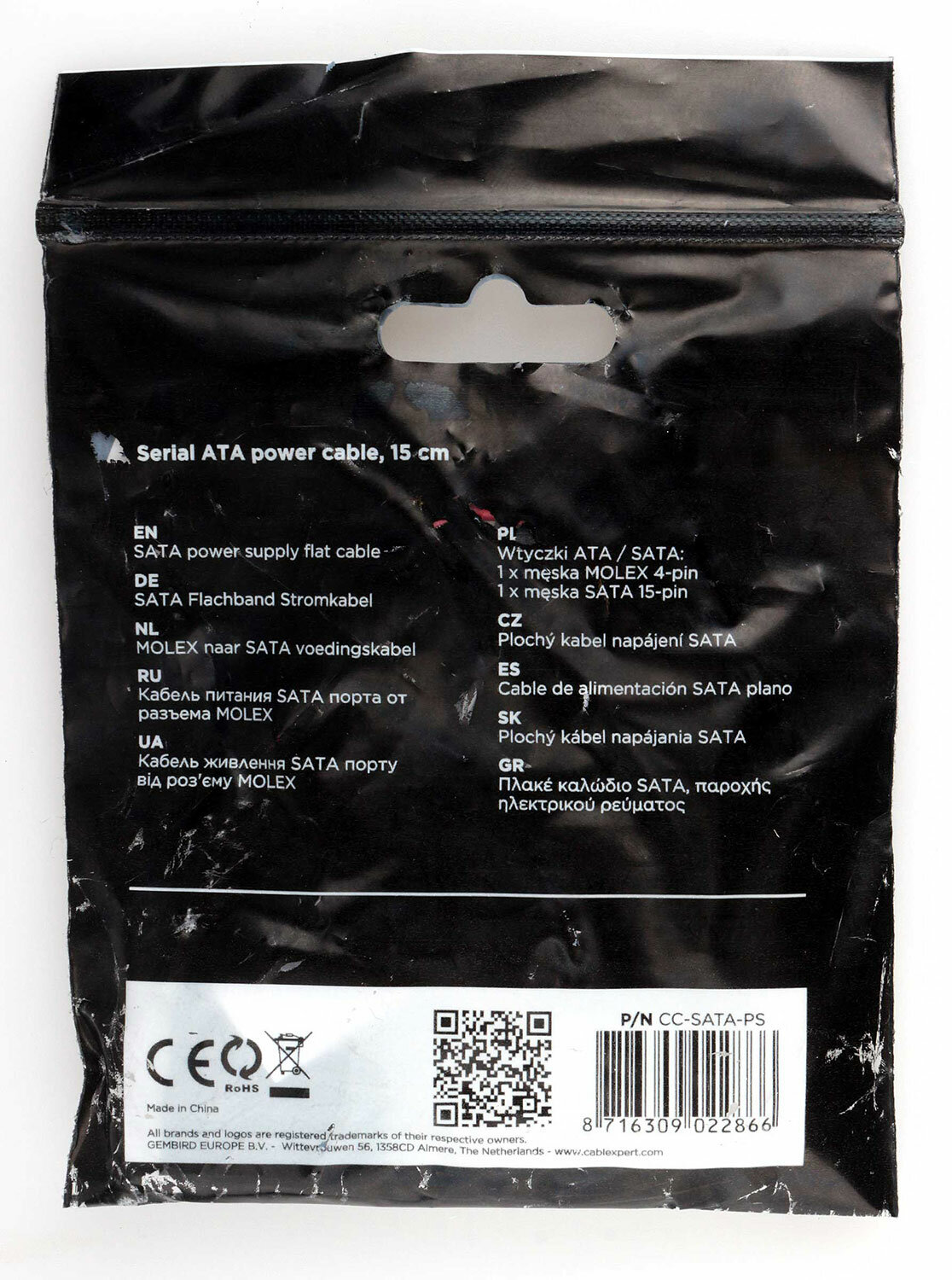 Кабель питания CABLEXPERT SATA CC-SATA-PS-M, 15см, sata 15pin/molex 4pin, пакет