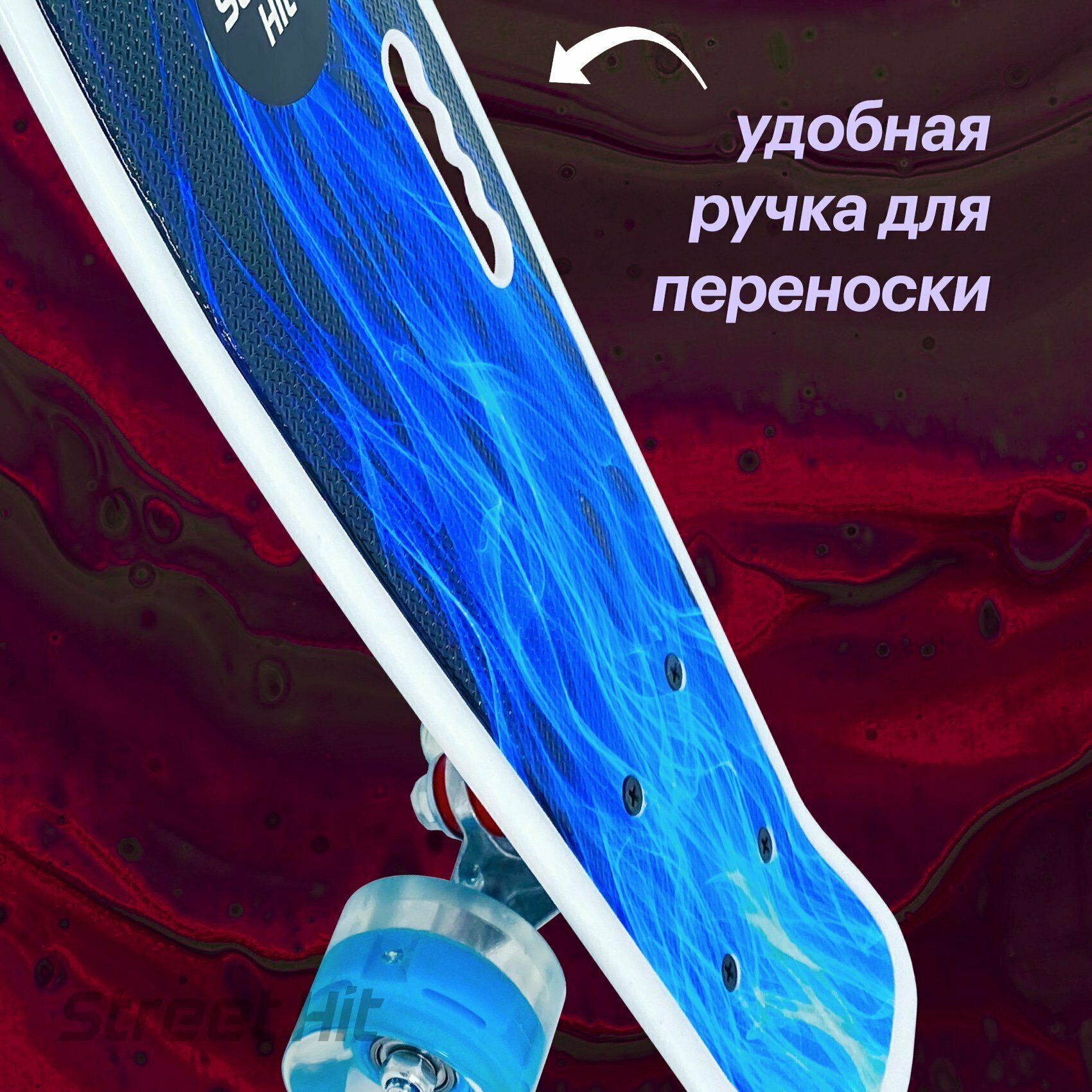 Скейтборд пенниборд Синее Пламя с ручкой, длина деки 55 см, светящиеся колеса интересное: