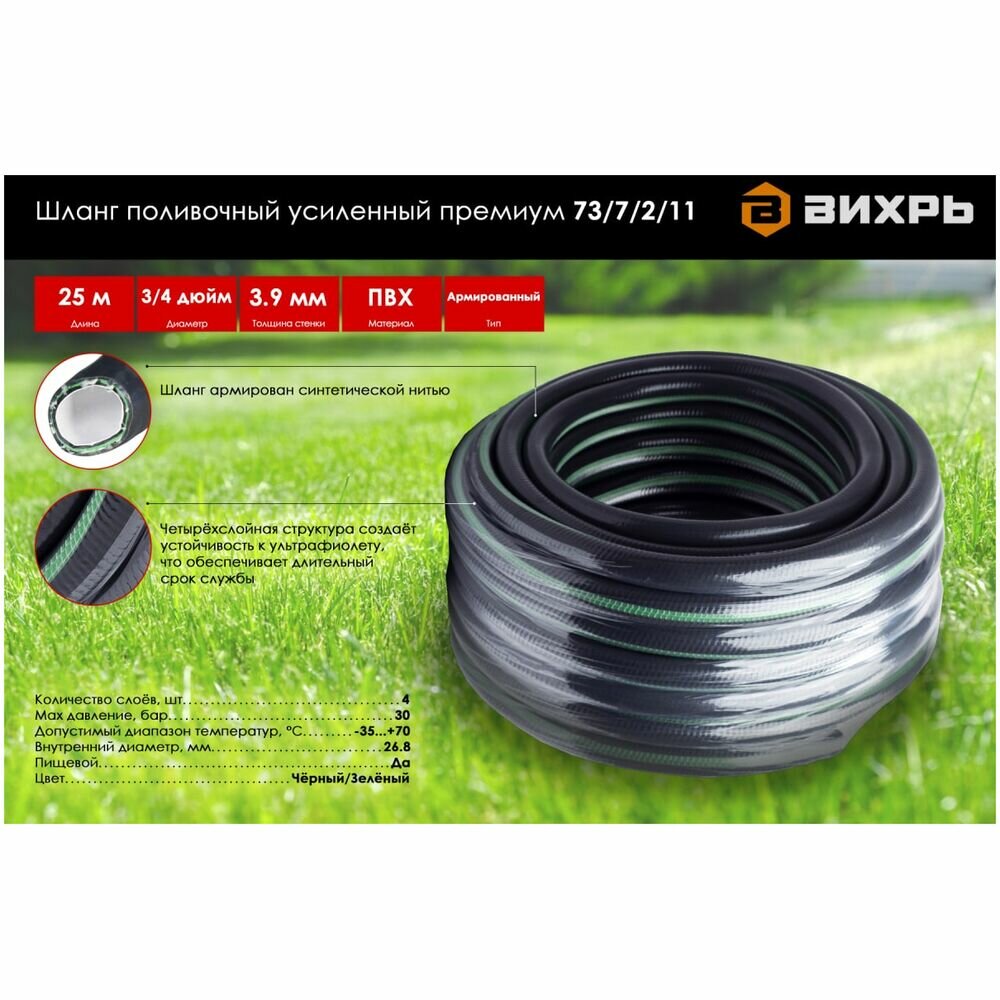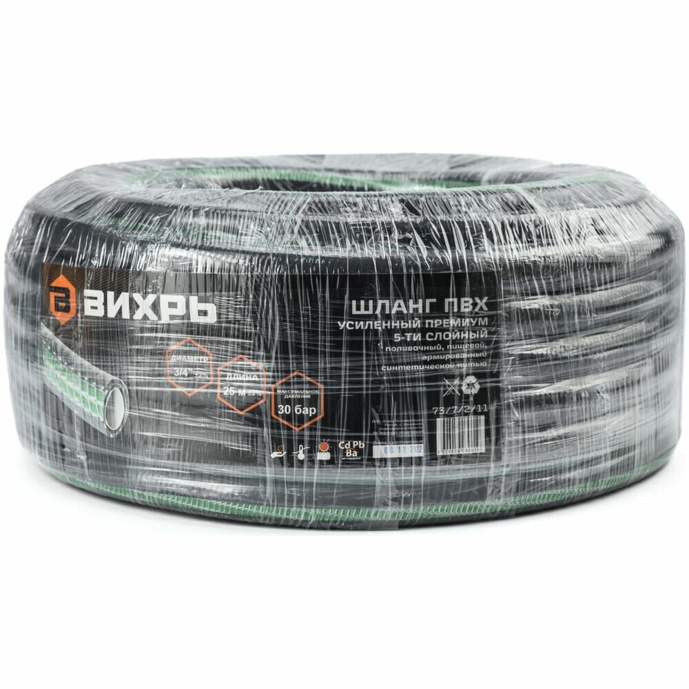 Вихрь Шланг поливочный ПВХ усиленный премиум, пищевой четырехслойный армированный 3/4, 25м 73/7/2/11