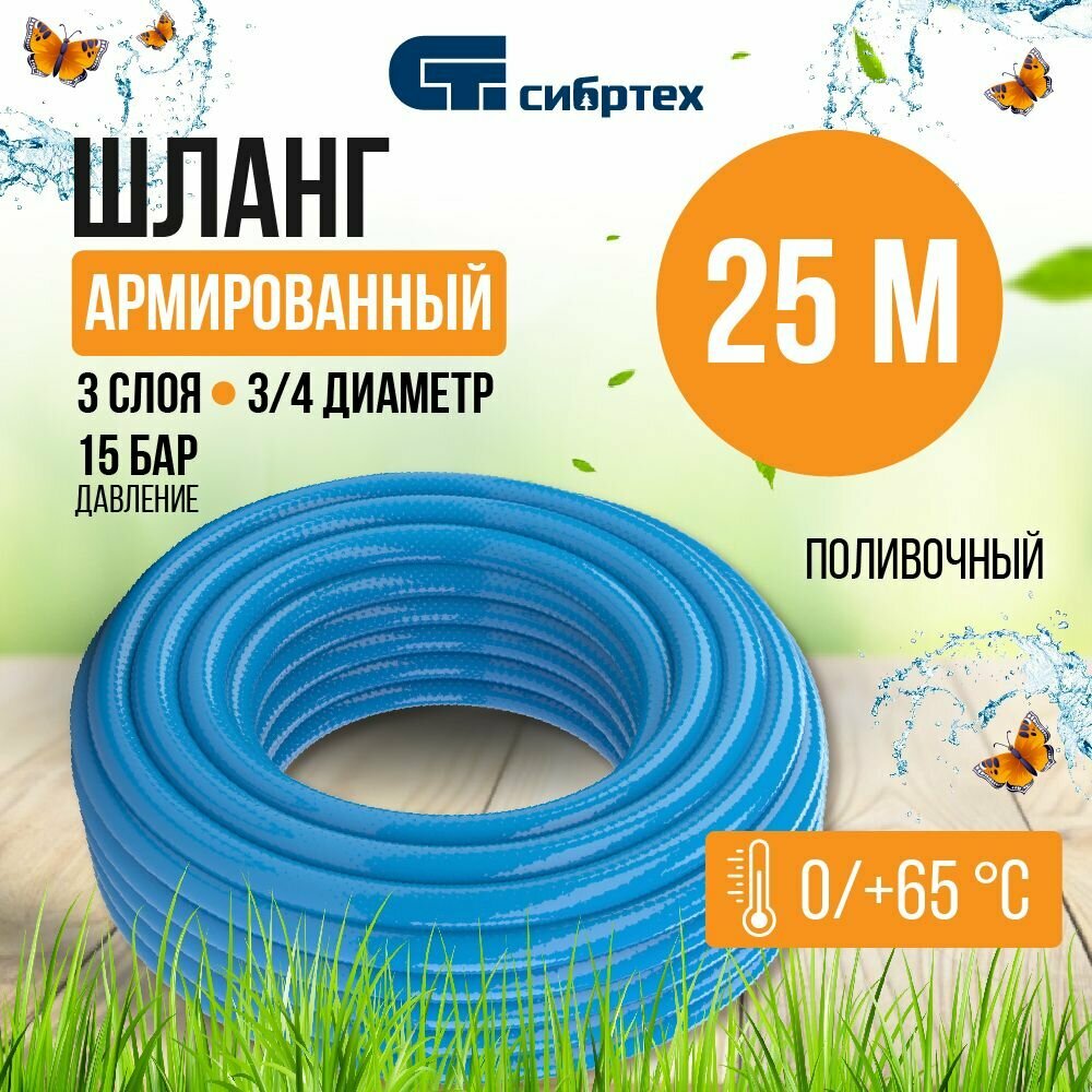 Шланг поливочный армированный, 3-слойный, синий, ПВХ, 3/4", 25 м// Сибртех
