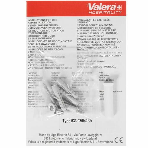 Фен настенный Valera Hospitality Premium Protect 1200 Shaver (533.03/044.06), мощность 1200 Вт, безопасная кнопка включения/выключения, настенный держатель c устройством защитного отключения, розетка для э/бритвы, холодный воздух, концентратор