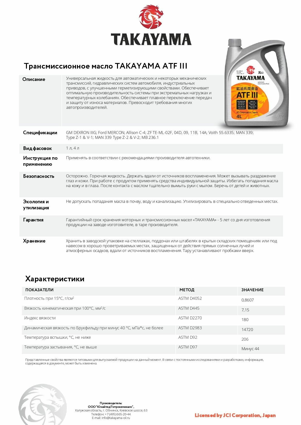 Масло трансмиссионное TAKAYAMA ATF III 4л. пластик