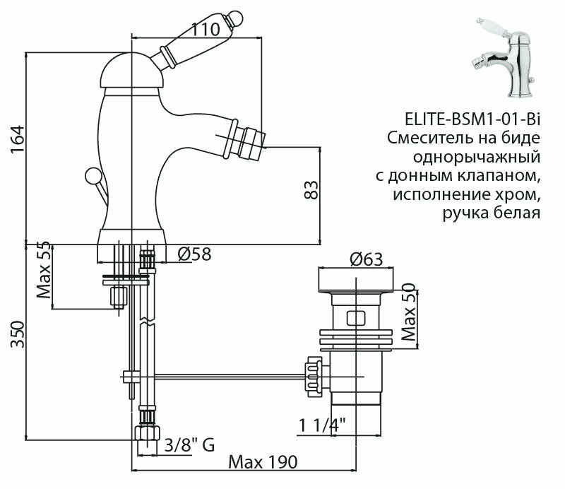Смеситель для биде CEZARES ELITE-BSM1-03/24-M с донным клапаном