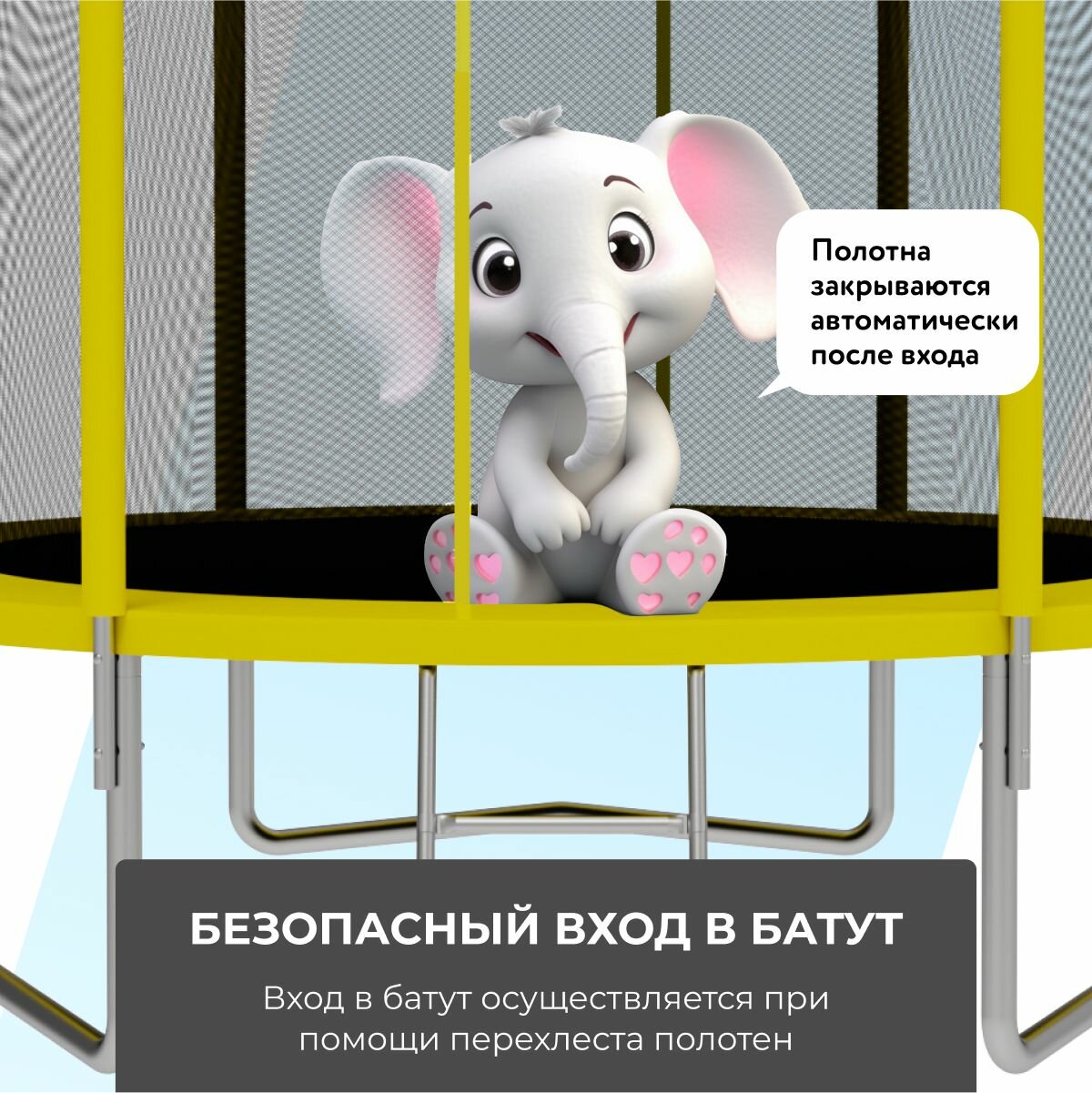 Безопасная конструкция за счёт расположения сетки. Очень понравилась конструкция входа внахлест без молнии (ребенок не выпадет, забыв застегнуть молнию). Пружины хорошие, жесткие. Отскок достаточно высокий. Дети довольны.