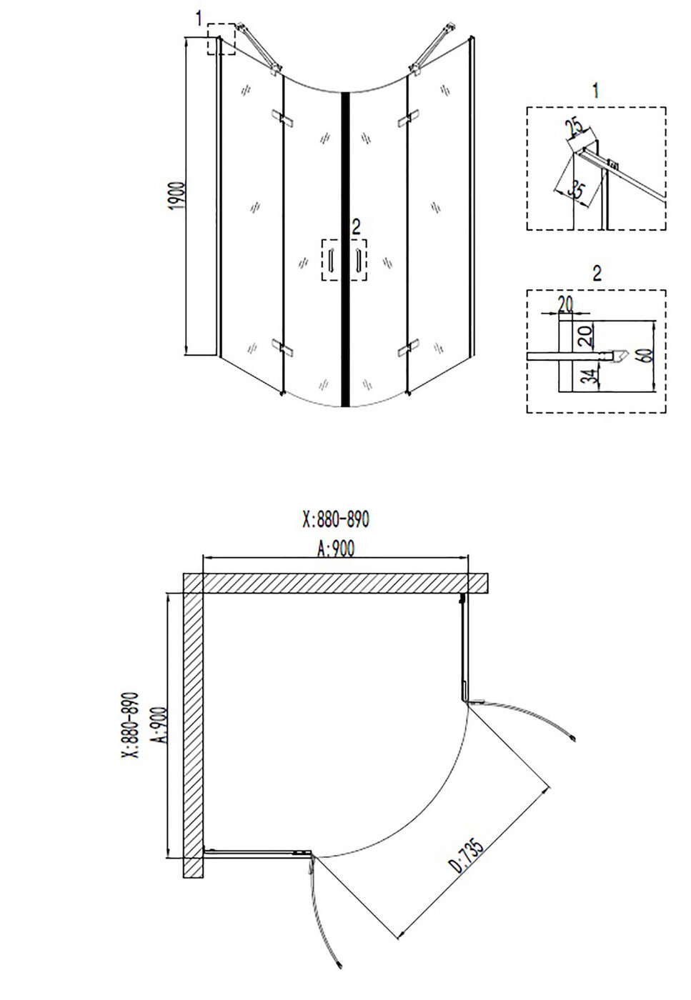 Душевое ограждение NG- 6615-08 (90*90*190) полукруг, двери распашные, 1 место