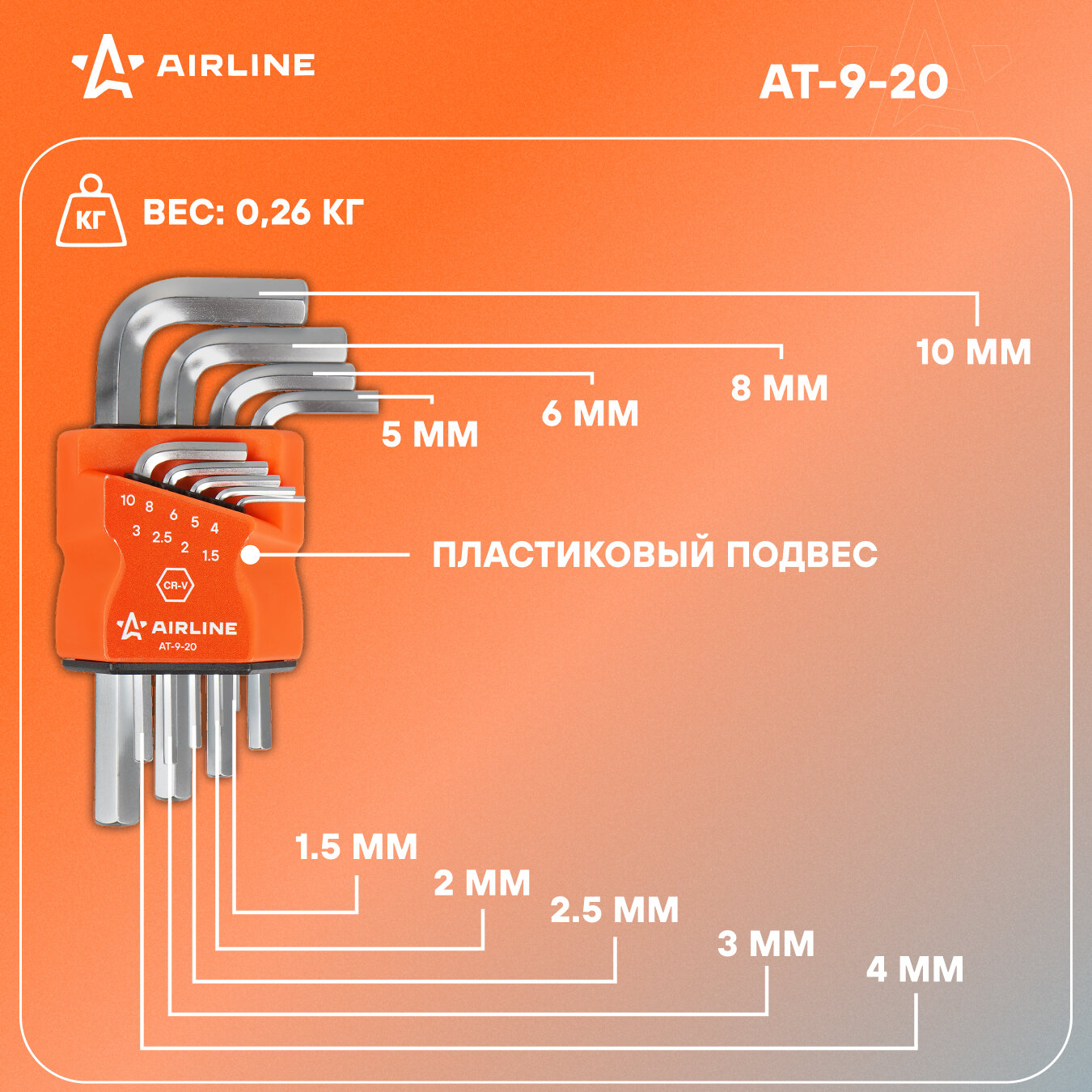 AIRLINE / at920 / Набор шестигранных ключей коротких 9 предметов (1.5,2,2.5,3,4,5,6,8,10мм) пласт.подвес
