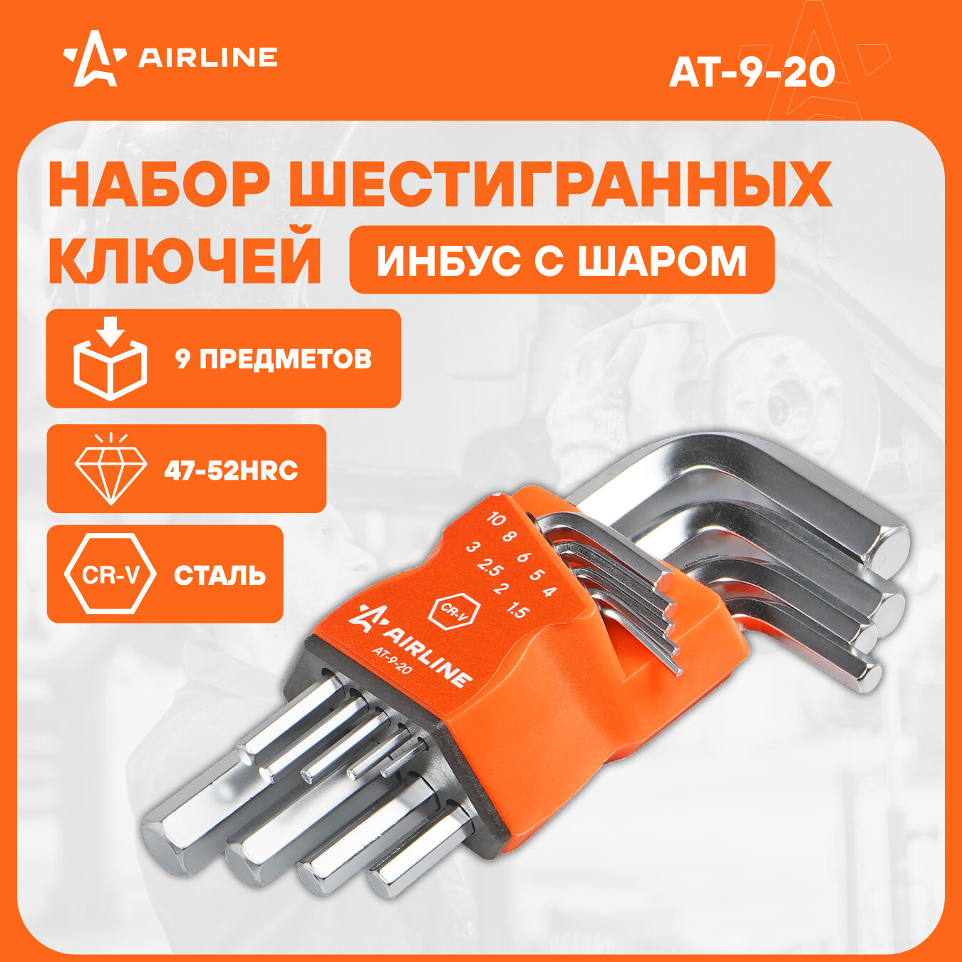 AT920 AIRLINE Набор шестигранных ключей коротких инбус 9 предметов (1.5 2 2.5 3 4 5 6 8 10мм) пласт.подвес (AT-9-2