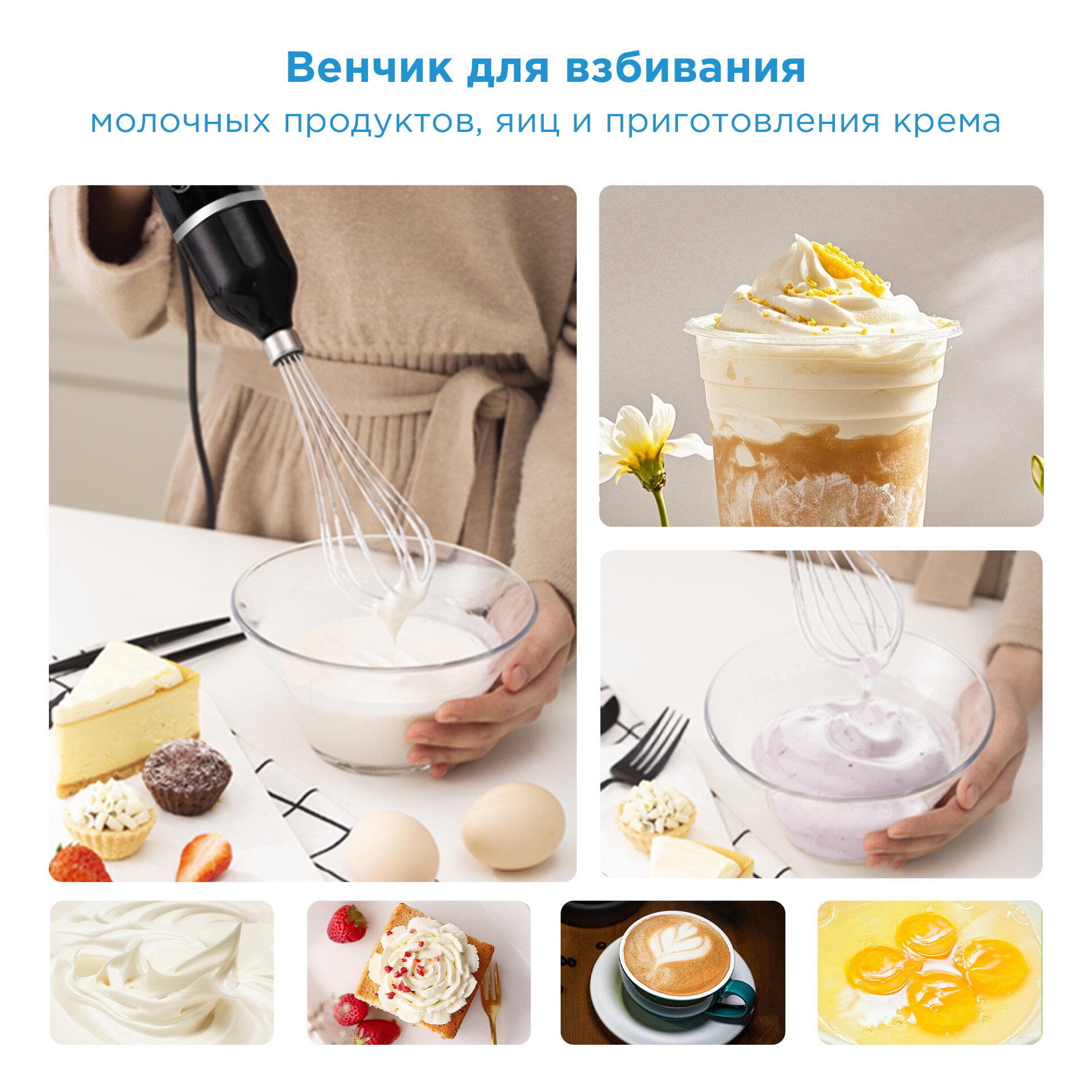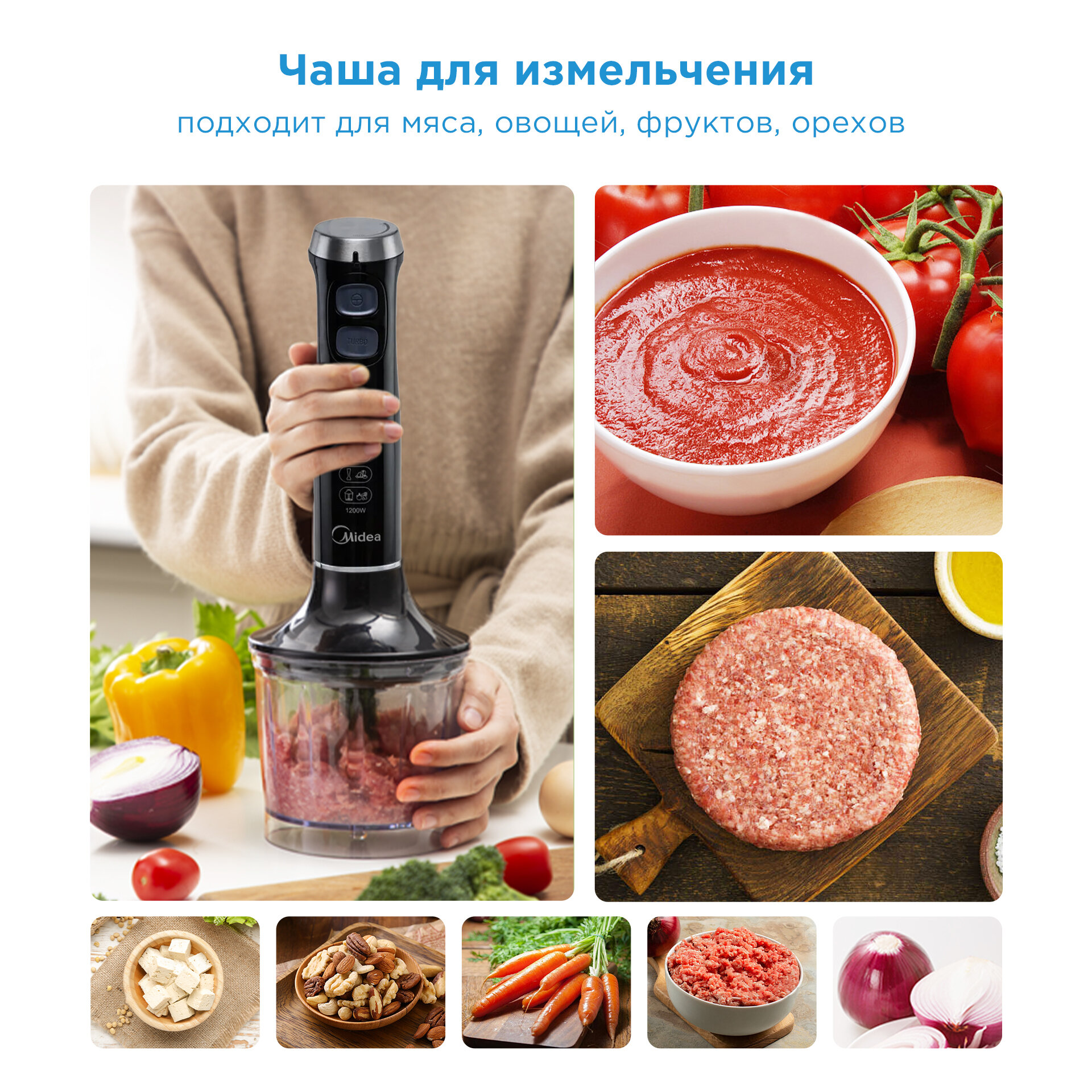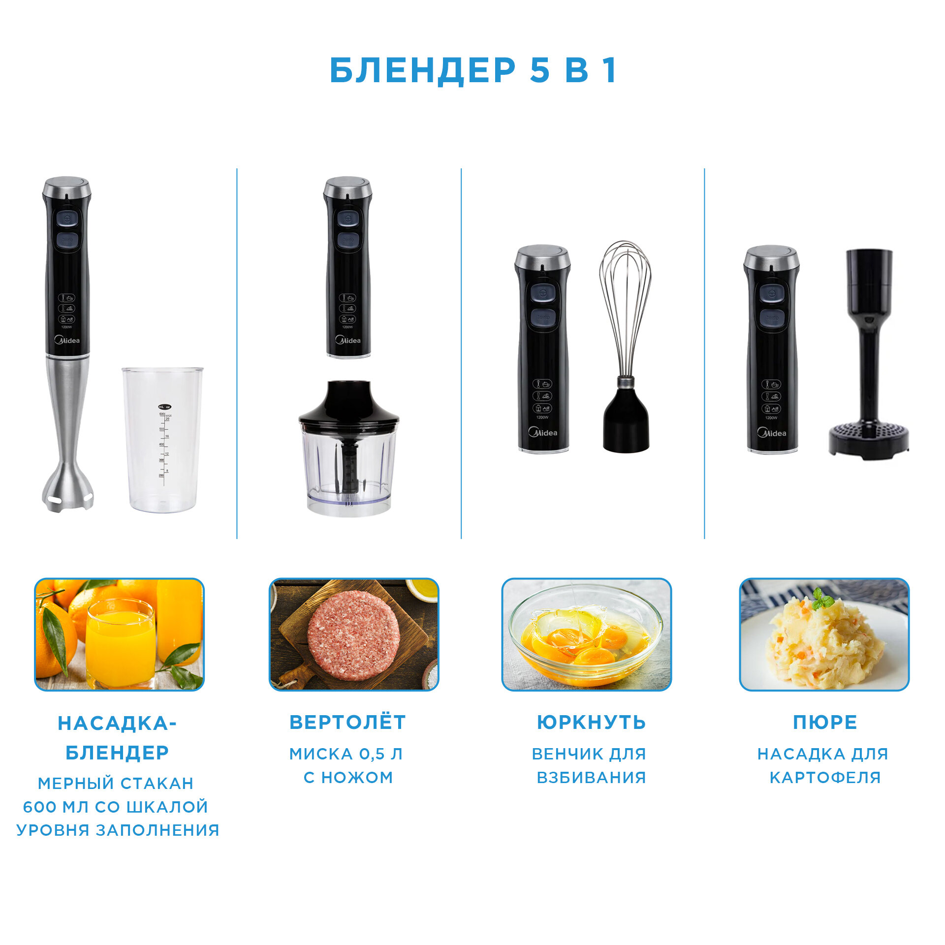 Купить Блендер погружной Midea MC-BL503, 1200 Вт, чаша 0,6 л, 3 насадки, 5 в 1, турборежим, насадка для пюре, плавная регулировка скорости, черный