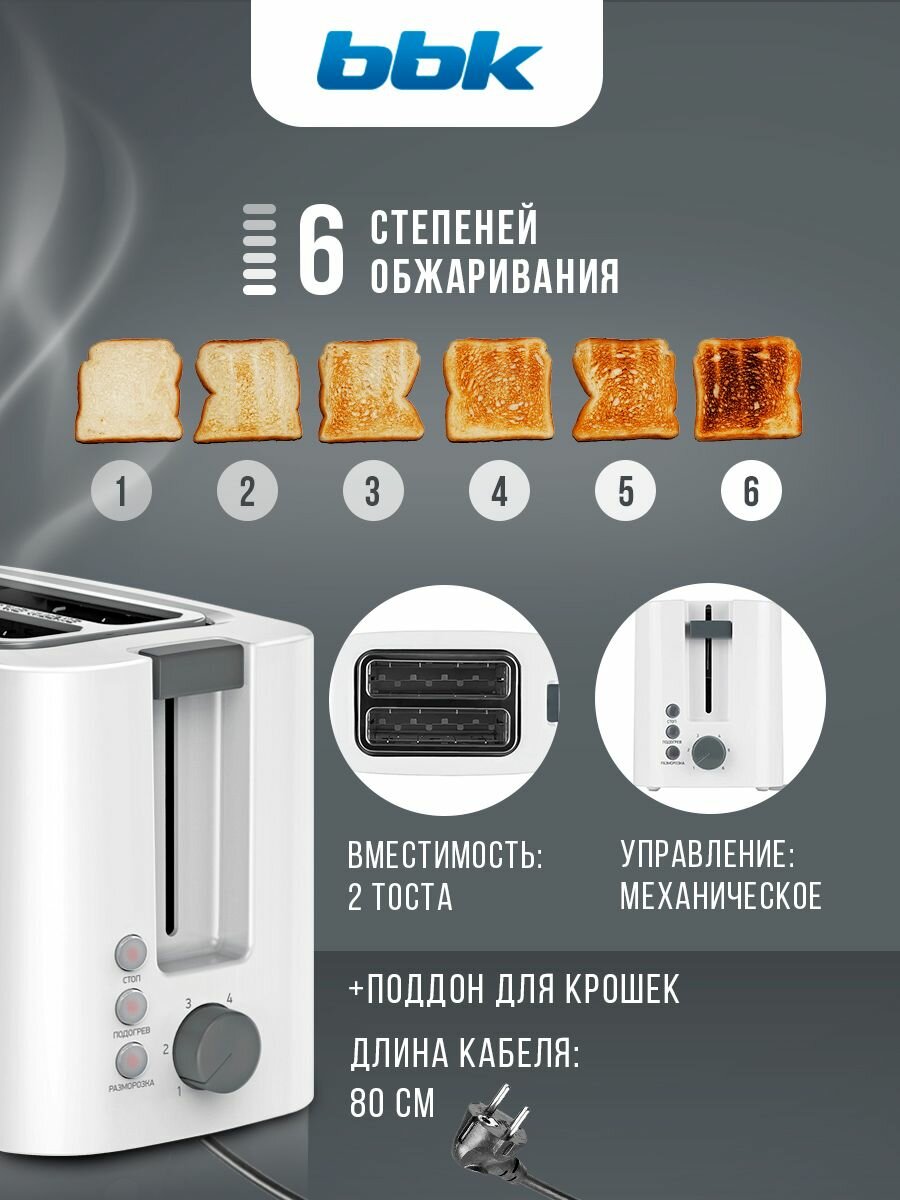 Купить Тостер BBK TR81M белый, 800 Вт, 2 тоста, функция подогрева и разморозки, защита от перегрева