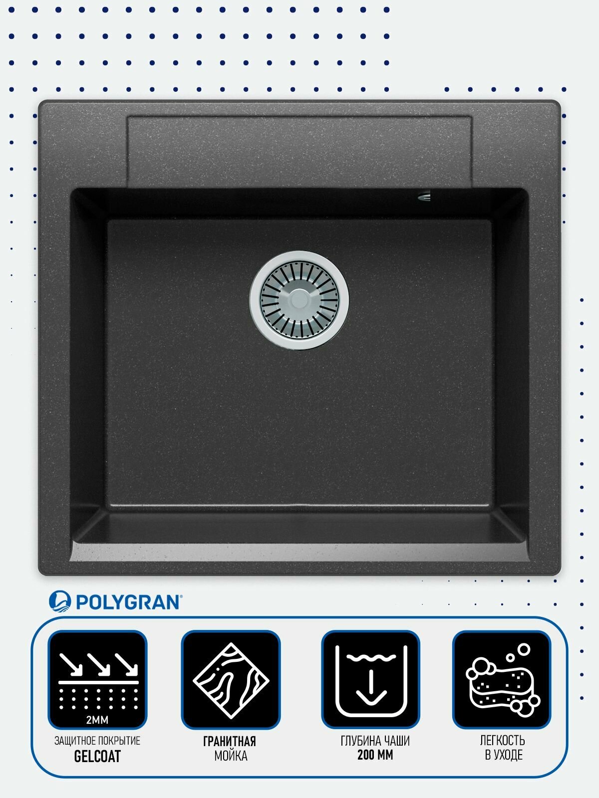 Мойка POLYGRAN, гранит-мрамор, ARGO-560, (510*560*200 мм), черный, сифон и сливная арматура