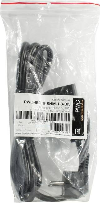 Кабель питания PWC-IEC19-SHM-1.8-BK (Schuko+C19) (3х1.5) 16А угловая вилка 1.8м | код.43798 | Hyperline (4шт.в упак.)