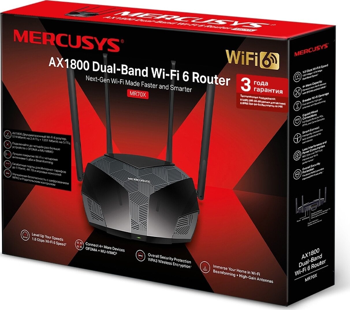 Mercusys MR70X AX1800 Двухдиапазонный Wi-Fi 6 роутер, 1201 Мбит/с на 5 ГГц и 574 Мбит/с на 2,4 ГГц, 1 порт WAN 10/100/1000 Мбит/с и 3 порта LAN 10/100/1000 Мбит/с, 4 внешние антенны 5 дБи, поддержка IPTV, IPv6, родительский контроль, WPA3, интерфейс настр