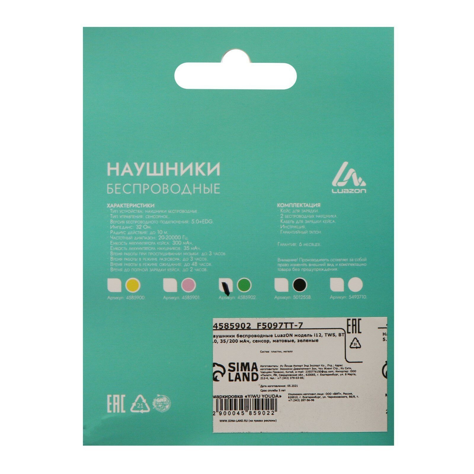 Купить Наушники беспроводные LuazON i12, TWS, BT 5.0, 35/300 мАч, сенсор, матовые, зеленые Luazon Home 4585