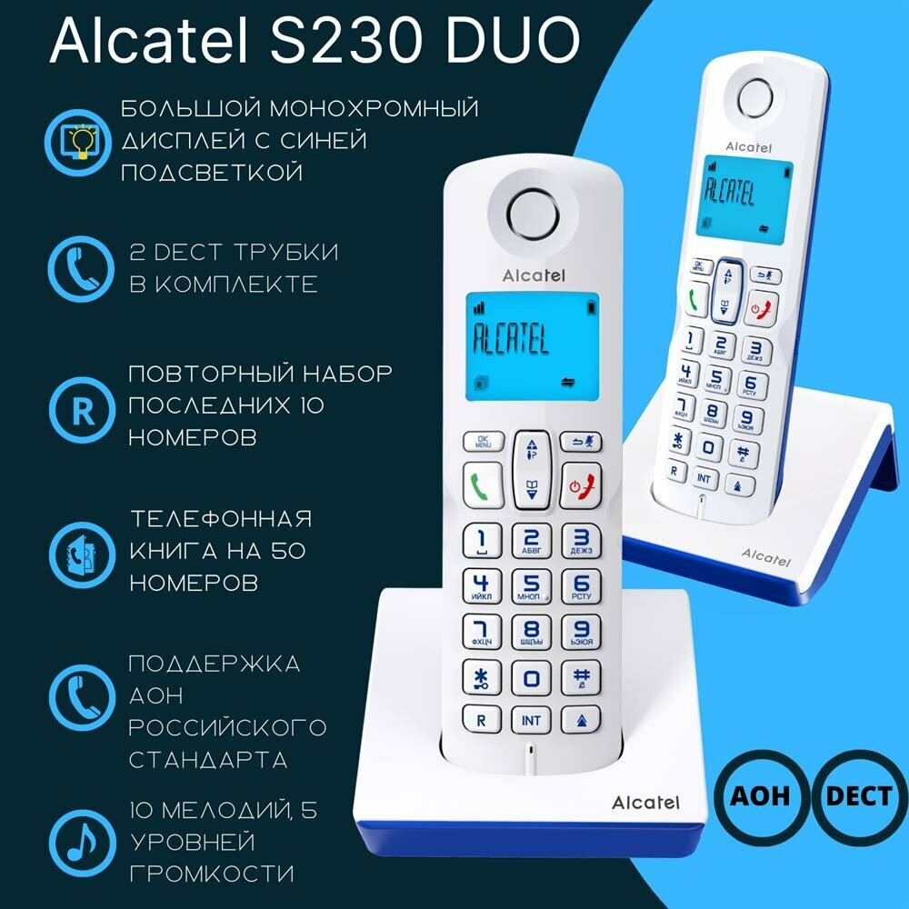Купить Тел. аппарат Dect Alcatel S230 Duo ru white белый (труб. в компл.:2шт) АОН