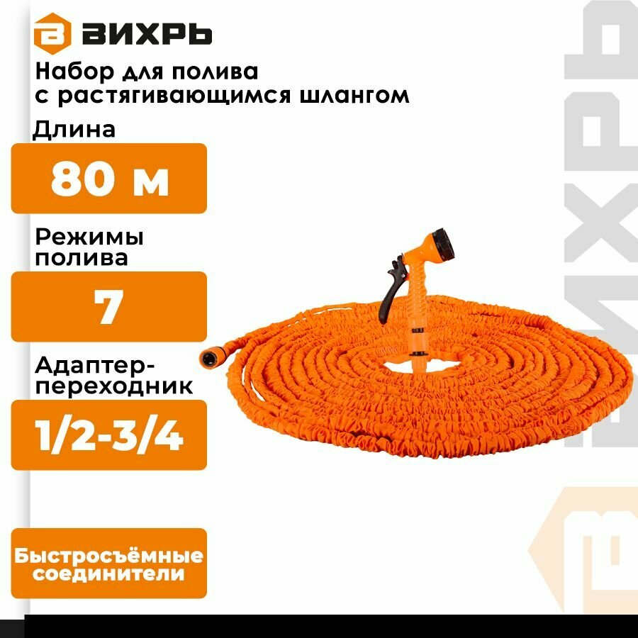 Набор для полива с растягивающимся шлангом Вихрь 80м, 73/7/2/38