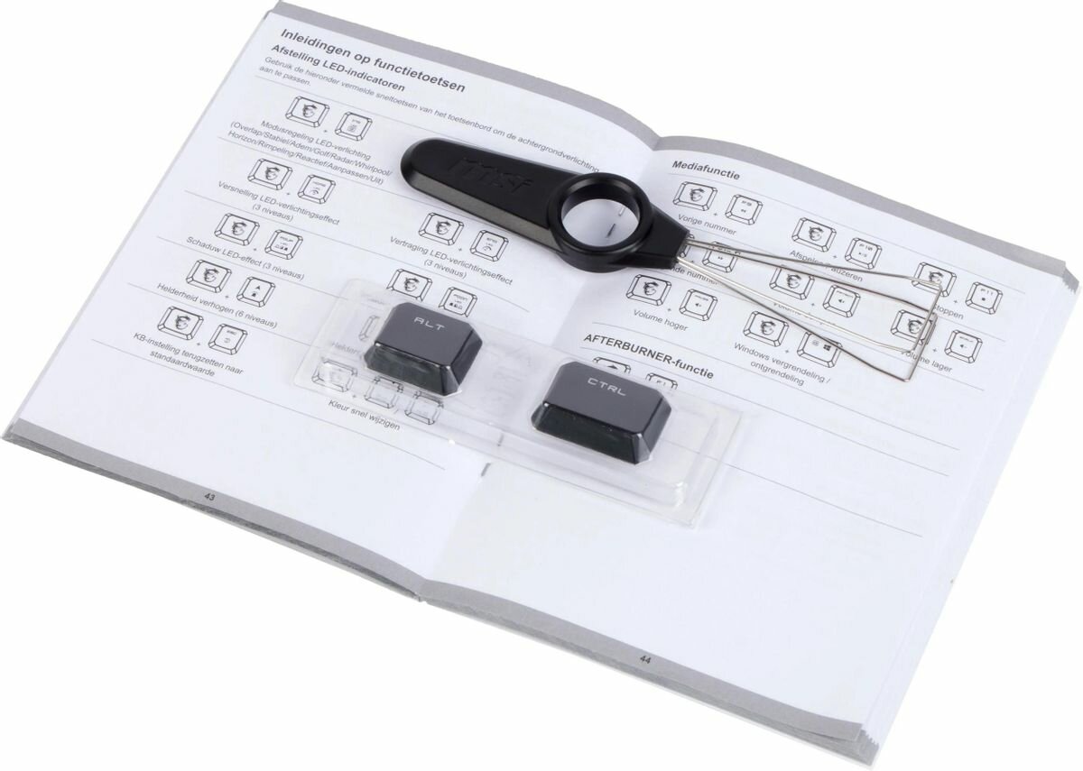 В комплекте есть дополнительные изогнутые клавиши Ctrl и Alt и простая прозрачная крышка на случай долгого простоя клавиатуры. Радует фирменный стиль написания букв от MSI. Клавиши на ощупь очень приятные, посмотрим, как скоро они сотрутся при постоянном использовании. Эта модель достаточно минималистичная в плане дизайна, но дёшево не выглядит, в том числе за счёт металлик-вставки. В темноте красиво отбрасывается свет вперёд, а вот вбок почему-то в этой модели решили не делать. Устойчиво стоит на столе, не ездит, не прогибается, поднимается стандартно на сантиметр. Звук для меня не очень громкий. Клавиатурой безусловно доволен. |