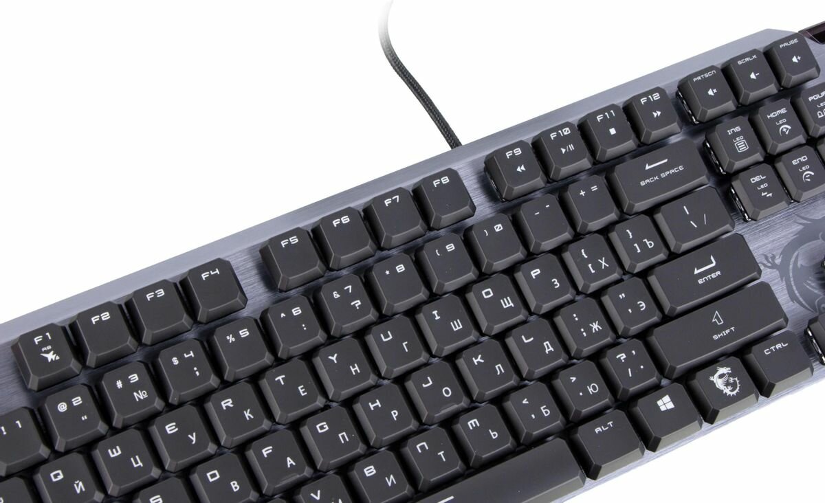Хорошо читаемый шрифт. Низкопрофильные механические переключатели. Возможность выбрать для каждой клавиши свой цвет (нужно скачать ПО Dragon Center от MSI). Продуманная эргономика. |