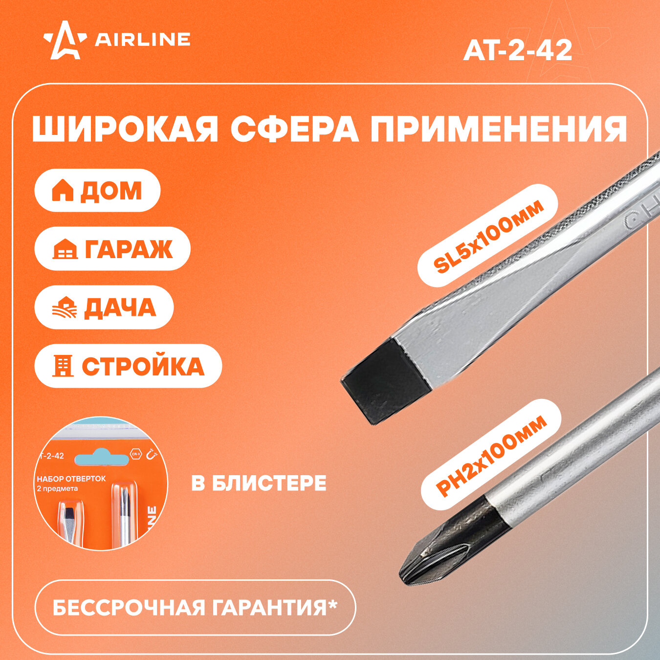 Набор отверток 2 предмета (SL5.51100мм,PH2100мм) блистер (AT-2-42), AT242 AIRLINE AT-2-42