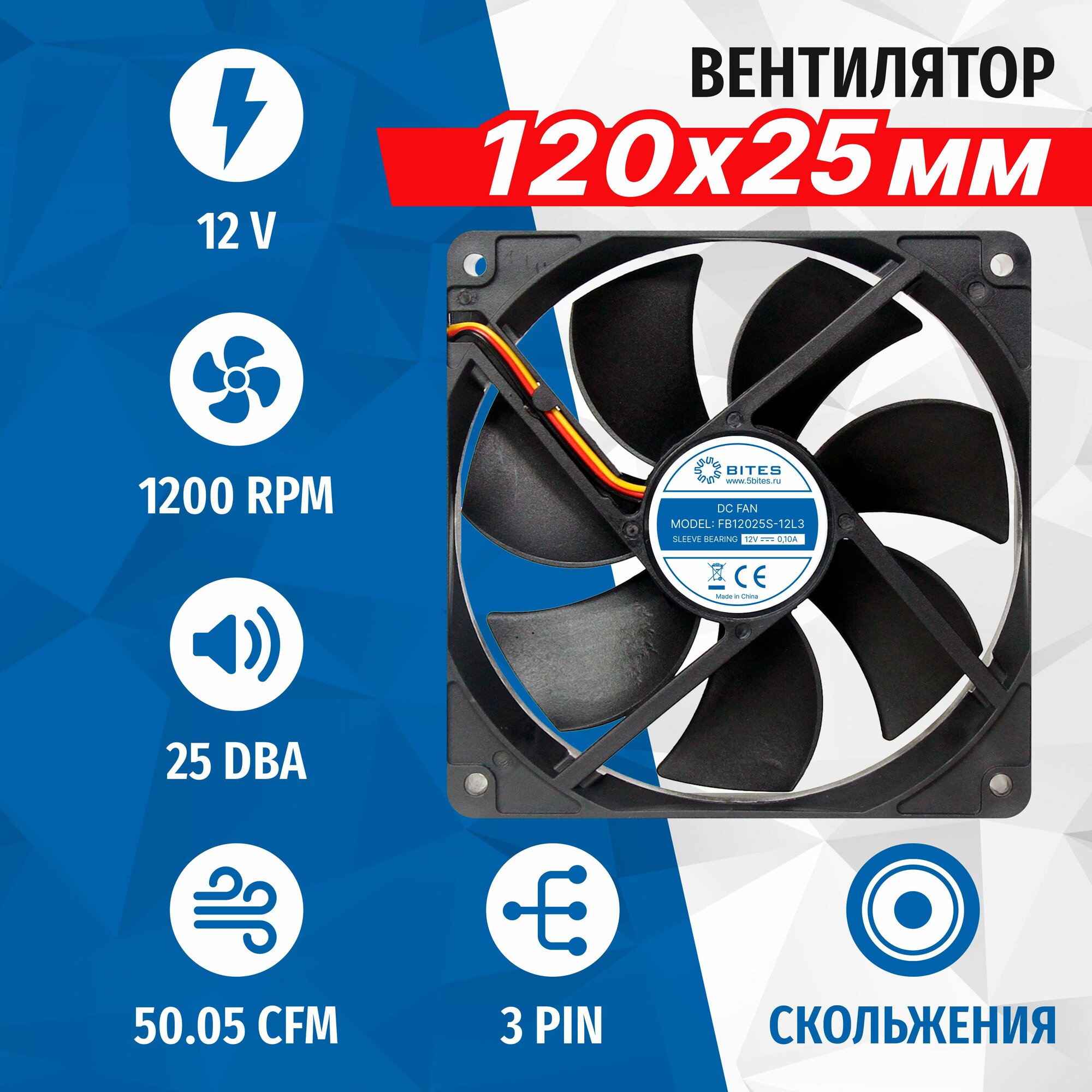 Купить Вентилятор 120x120x25мм 12в, 3pin, подшипник скольжения, 1200rpm, 25 дБ, 5bites FB12025S-12L3