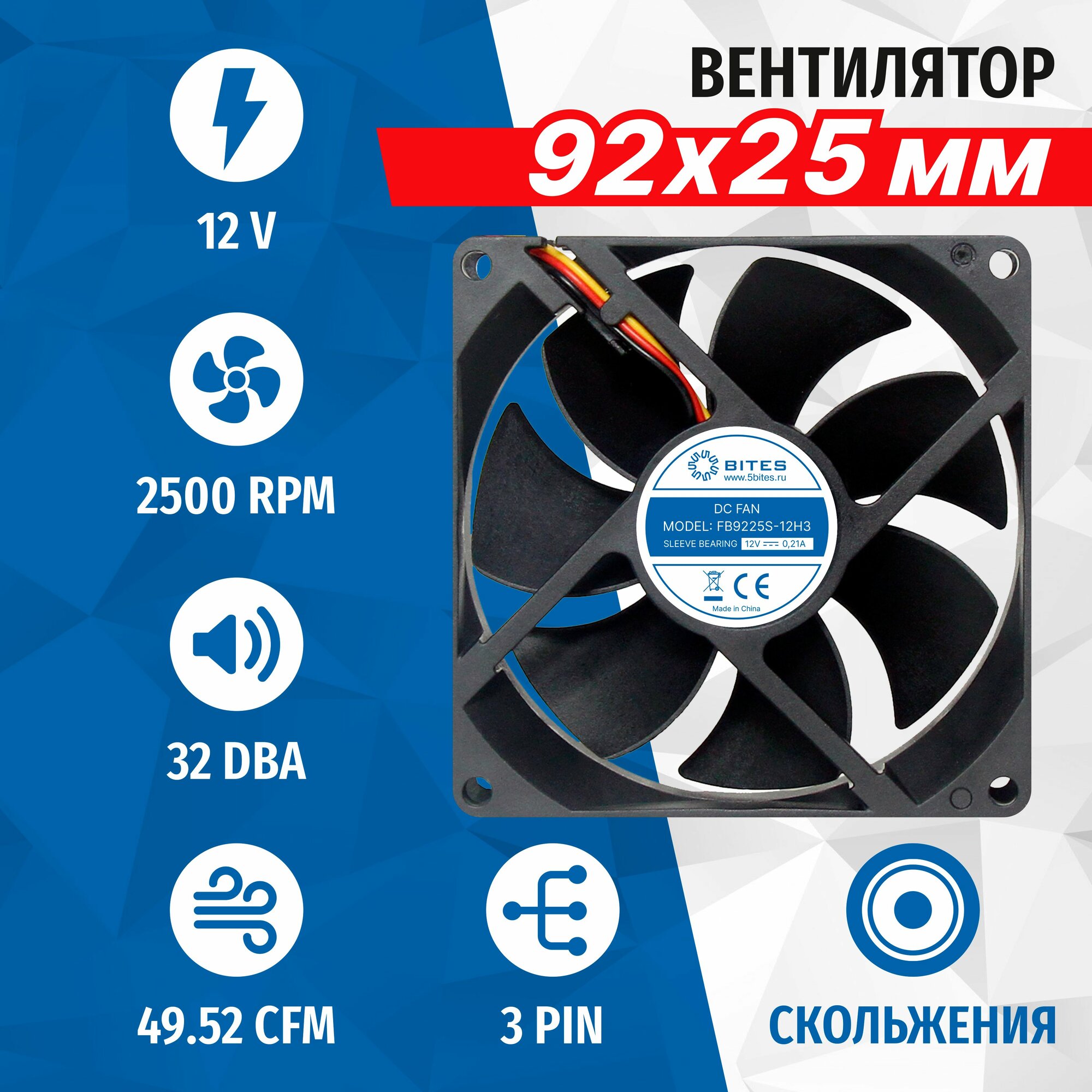 Купить Вентилятор 92x92x25мм, 3pin, 12в, подшипник скольжения, 2500rpm, 32 дБ, 5bites FB9225S-12H3